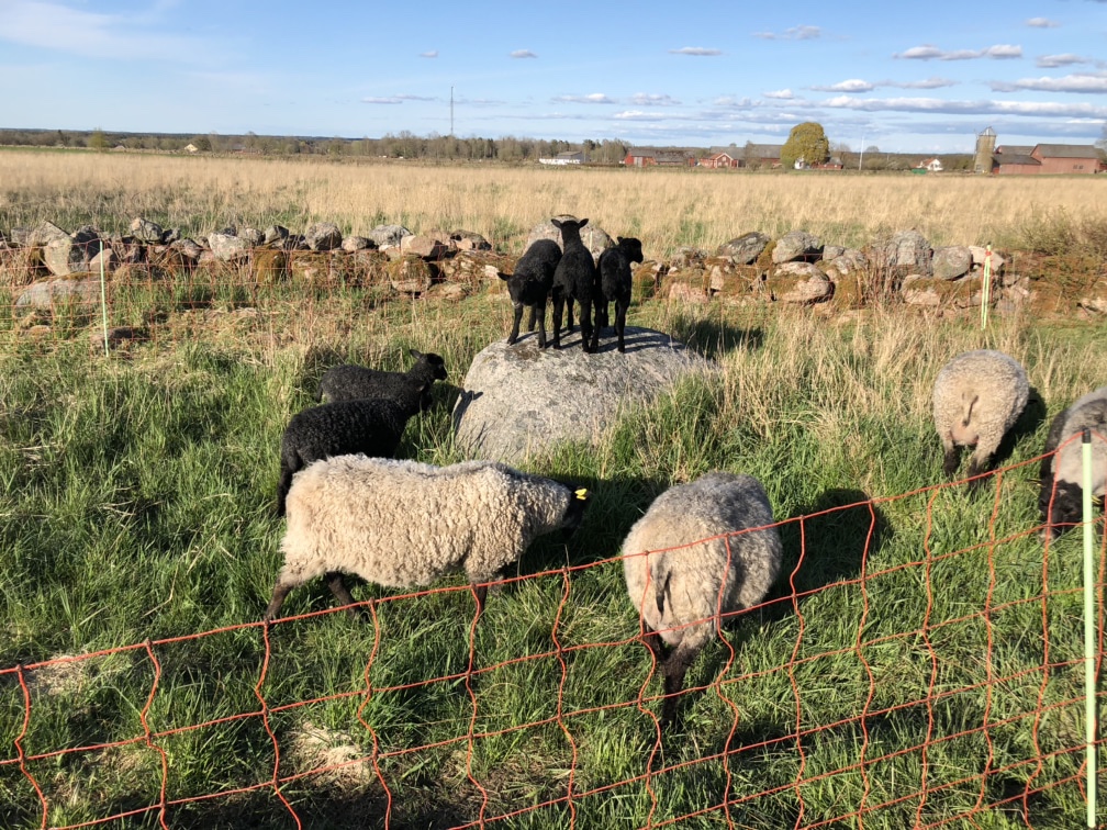 Axel körde lite med röjsågen runt ”Trekanten” medan jag lagade mat och när den var intagen åkte vi och hämtade hem fåren, och släppte den på Trekanten. Lammen käkar och växer!