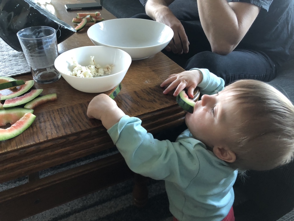 Och på kvällen hade vi fredagsmys med popcorn och vattenmelon. Nora är stundtals lite manisk på vattenmelon, haha. Så söt.