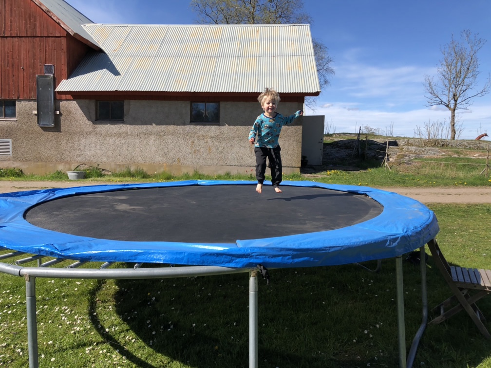 Vi drog fram studsmattan som vi fick av de förra grannarna i samband med flytten också, för att se lite i vilket skick den är i. Det saknas skyddsnät som vi får fixa, och den har lite skavanker, men kan nog funka.