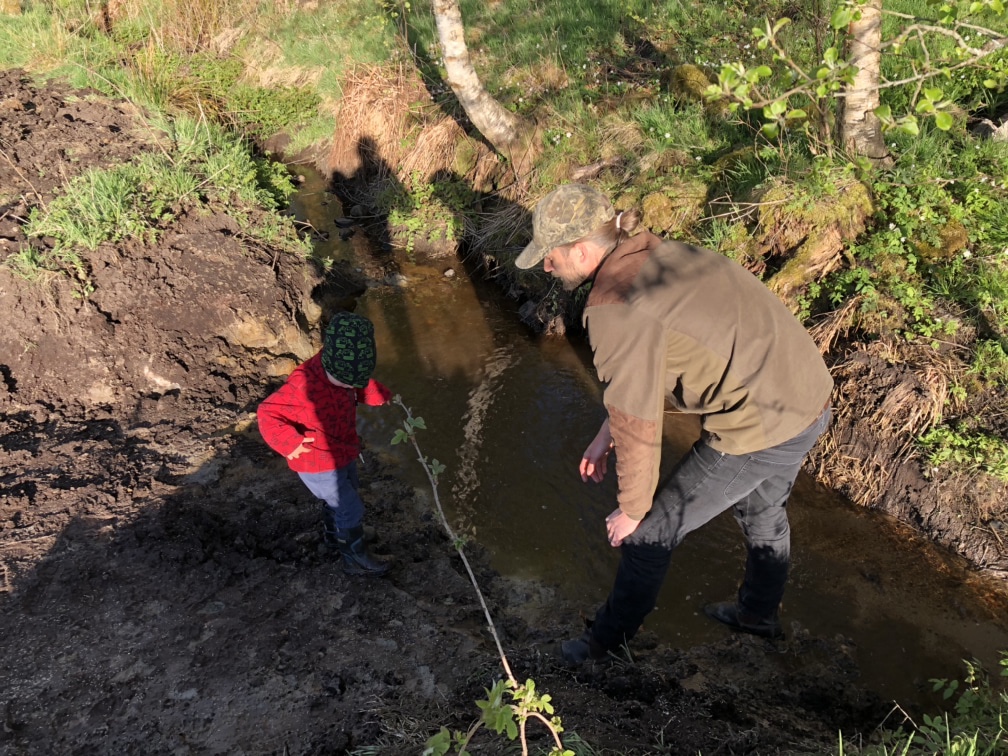 Göran hade varit där med sin grävmaskin och släntat av lite ner mot bäcken som rinner genom hagen. När vi är klara med staketet runt hela hagen kan fåren då gå ner och dricka i bäcken, så slipper vi släpa dunkar med vatten!