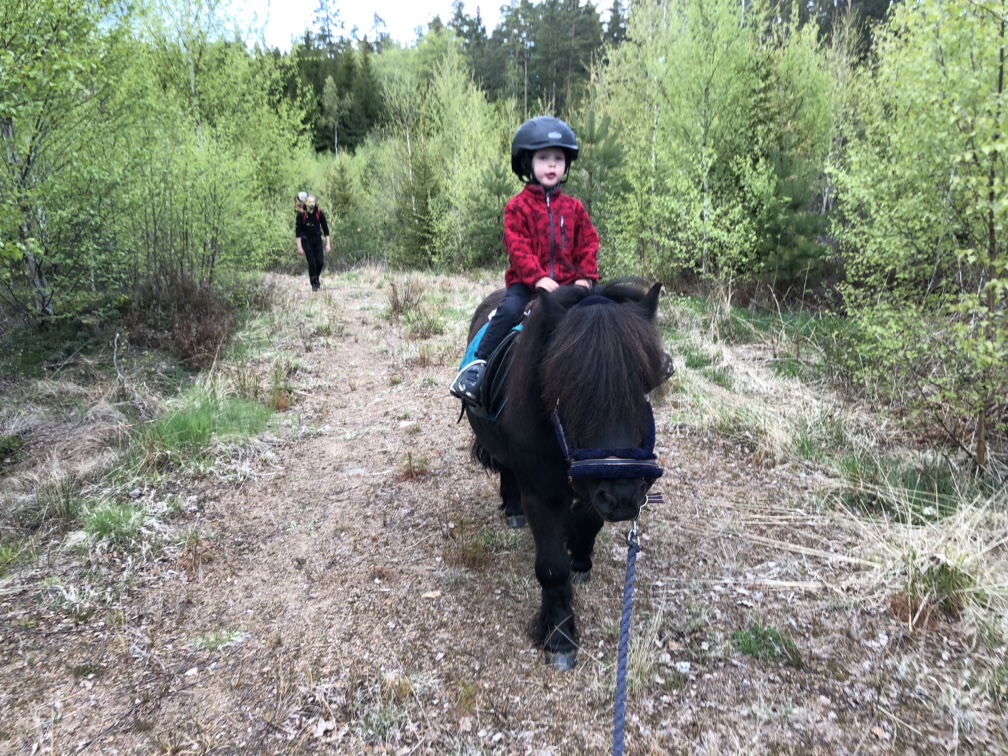 Fyra kilometer mestadels i skogen gick vi och han är ju en klippa den här ponnyn. Över stock och sten och ris och över en liten ”bäckskåra” utan att blinka. Vi gick igenom två grindar till ett viltstängsel också. Vid den andra grinden fanns det en dörr bredvid grinden som var enklare att öppna. Assim klev igenom den också, och lyfte fint på benen över den rätt höga tröskeln.