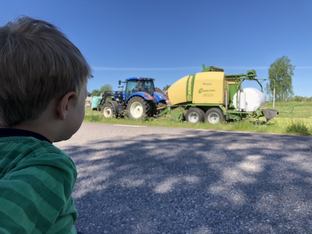Hon tröttnade ju dock därför rätt snart så då fick vi gå hem igen så hon kunde somna i vagnen. Lyckligtvis var det full showtajm på åkrarna med strängning av hö och höbalstillverkning så Loke misstyckte inte.