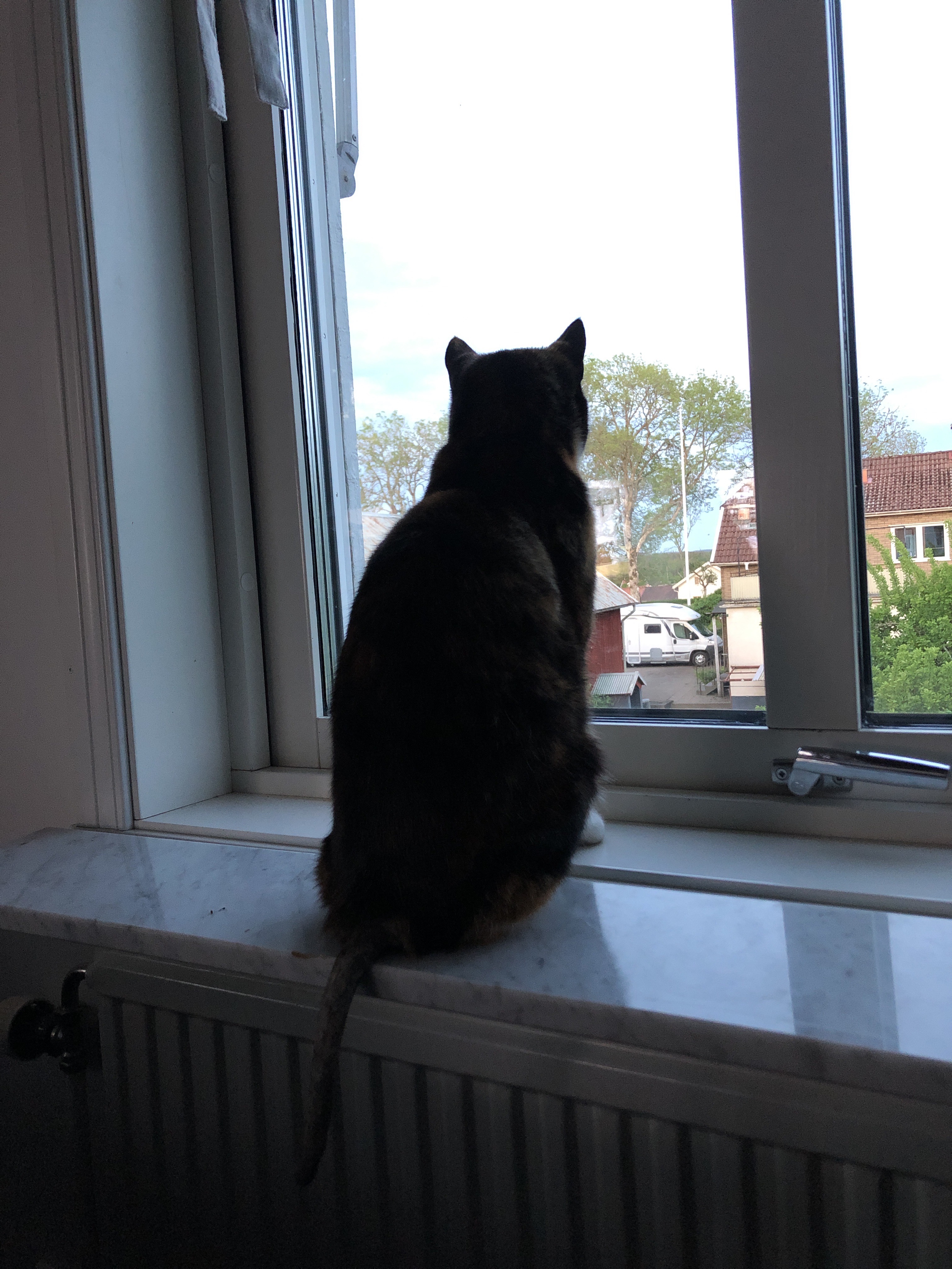 Och så Hekla-status då så här nästan en vecka efter svansolyckan. Jodå hon kom ju snart på att hon kunde komma åt att slicka på svansen trots tratt. Vi konsulterade veterinären och de föreslog större tratt men det kändes som att den tratten skulle behöva vara enorm för att funka. Därför ”fick vi lov” att testa med luftigt bandage i stället. Hekla slapp då tratten vilket var rätt skönt. Det var jobbigt att se henne försöka klia sig, tvätta sig, äta och dricka normalt mm. Men gladast var nog katten! Bandaget gjorde vi med hjälp av överblivna grejer från Kaprifols operation och det funkade ok. Vi fick byta varje dag för Hekla tuggade sönder det lite, men svanstippen har hon låtit vara och det ser fint ut. Så nu slipper hon även bandaget och hon verkar låta den vara i fred för det mesta.