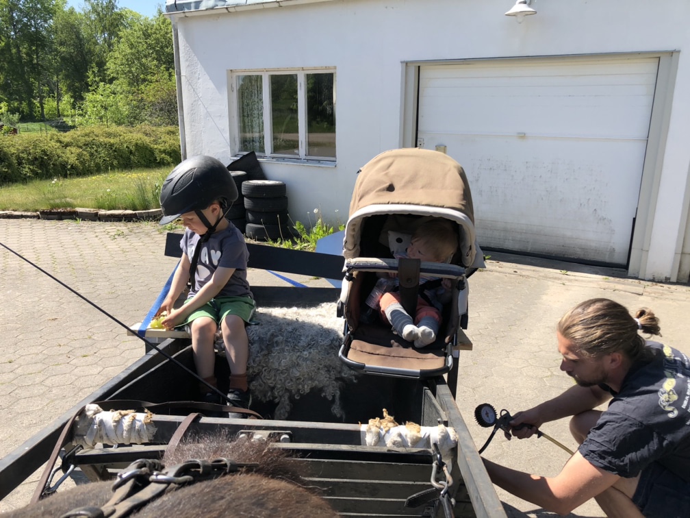 Ännu en varm dag till ända. I morse fick vi sova till halv åtta, men det hjälpte ju inte riktigt när Nora haft en riktigt kass natt. Hon har sovit dåligt även dagtid i ca en veckas tid och inte alls följt sitt vanliga schema. efter den här natten tänkte jag då att hon skulle sova ordentligt under förmiddagspasset. Så när hon somnat under förmiddagen parkerade jag henne under Axels öppna kontorsfönster och tog med mig Loke till stallet för en runda med ponnyvagnen. Nu när babyskyddet är återlämnat kan ju inte Nora hänga med på samma sätt som förut. Men nu skulle hon ju ändå sova flera timmar! Eller inte.. Jag hann inte ens sela klart ponnyn innan Axel kom in i stallet med en vaken Nora i famnen. Så hon fick ju hänga med på rundan helt enkelt. Axel gillade dock inte tanken på att jag skulle ha henne i knäet så han hittade på en annan lösning.