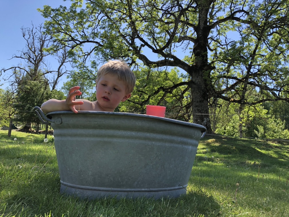 Dagens andra aktivitet som är värd att nämna (eftersom den finns på bild) är bad i balja!