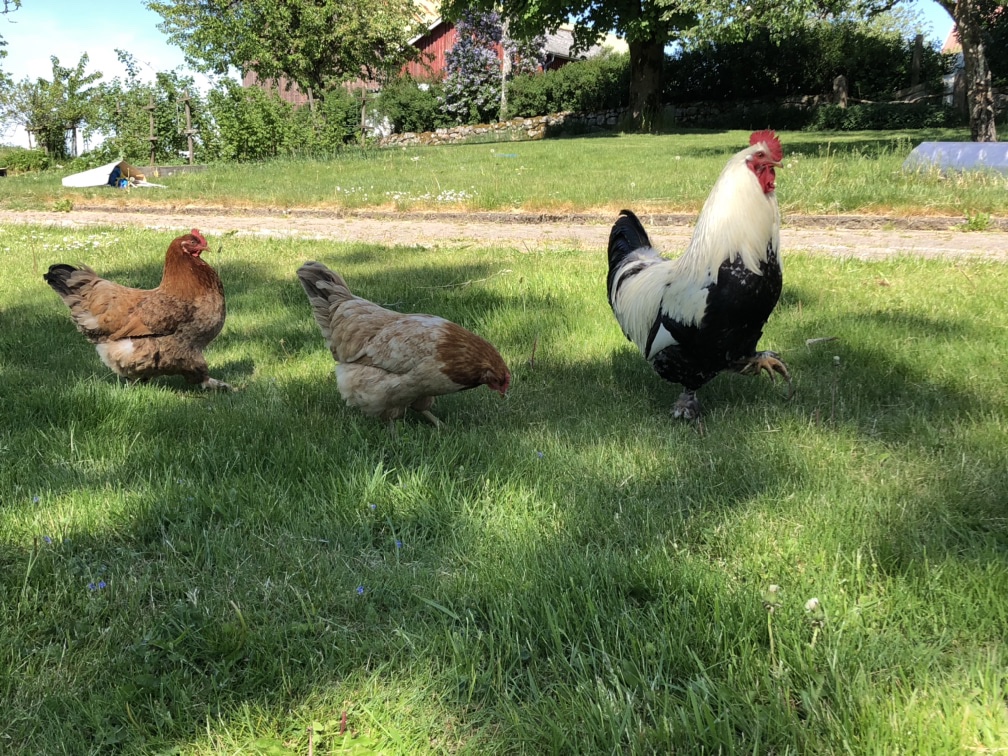 Den ljusa hönan i bild (Mc Nugget) är den hönan som var extramamma till den äldre kycklingen. Hon har nu övergett sin mammaroll och låter Koppar sköta det själv och jag tror att hon la sitt första ägg idag efter uppehållet! Inte illa.