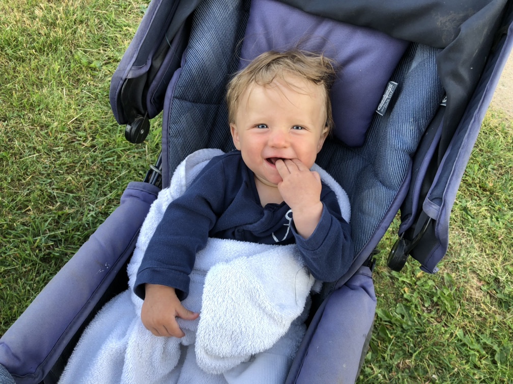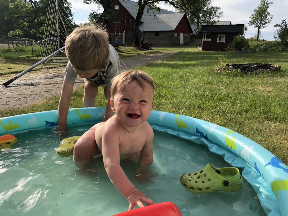 Under eftermiddagen blev det lite lek, urmockning av boxen i stallet, och middag. Efter middagen klippte vi gräset och Nora ville bada lite så det fick hon en stund innan det blev lite kallt.