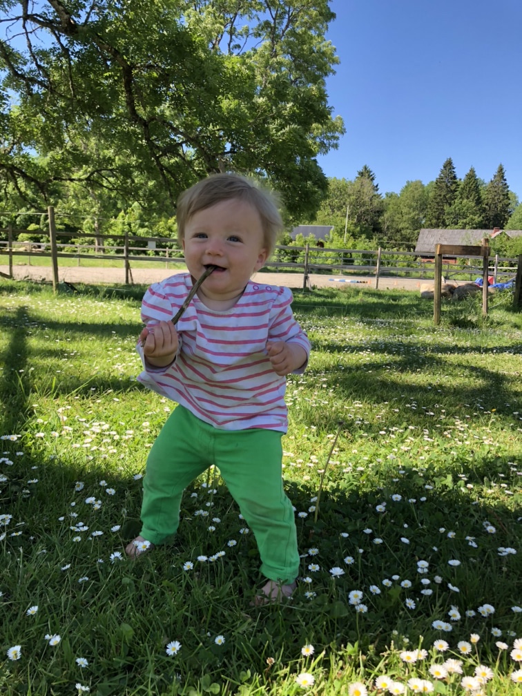 Idag har det inte varit många ”lediga” minutrar! Loke lämnades på förskolan och Nora fick som frukostgröt därefter, och sen gick vi ut. Jag skulle hjälpa Beatrice att hoppa lite med Kaprifol så jag drog fram lite hindermaterial medan Nora kravlade omkring.