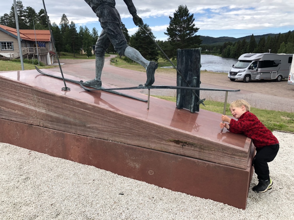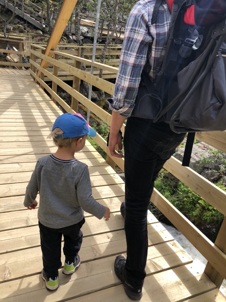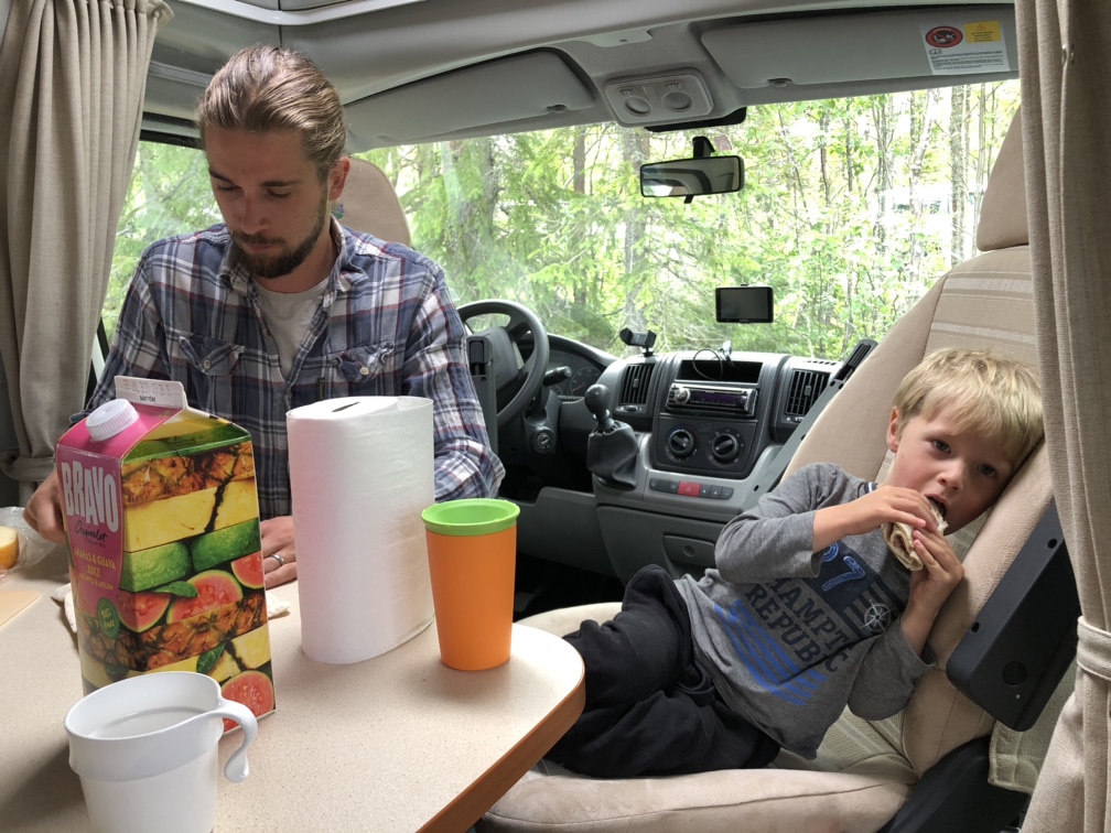När vi var nöjda satte vi oss i husbilen med gpsen inställd på målet för dagen; Njupeskär. Det var knappa två timmar kvar och resan gick smidigt. Nora sov nästan hela vägen, vi stannade halvvägs för fruktpaus och Loke kastade några stenar i en fors. En extra paus för Lokes toalettbesök, men sen var vi framme. Tomt på folk på vägarna men parkeringen vid Njupeskär var smetfull!! Vi fick åka runt en bra stund innan vi lyckades klämma oss in på en plats. Och lunchade på tunnbrödsrullar innan vi gav oss iväg.