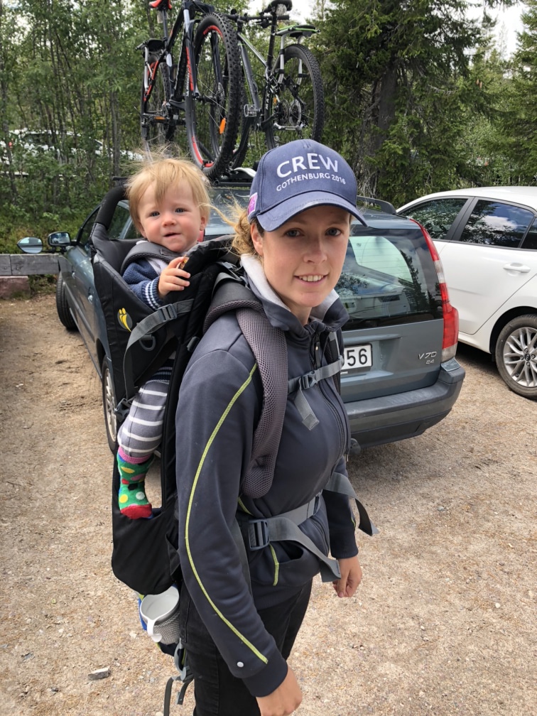 Loke gick själv en liten bit, men trivs annars rätt bra på ryggen.