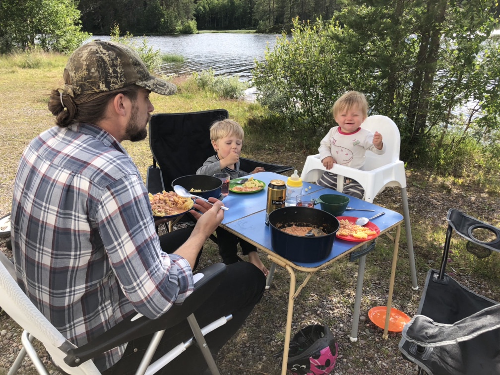 Och matlagning; nåt så lyxigt som korv stroganoff (Lokes favorit). Men all mat smakar ju gott på semestern, och ännu godare blir det ju ute så här vid vattnet!