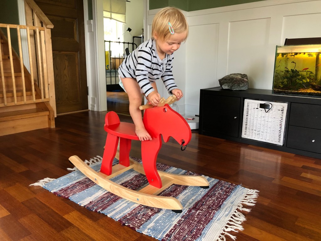 Efter lunch åkte Axel iväg en sväng och fixade lite med en fårhage hos Håkan som gärna kunde betas; lite röjsåg och utbyte av nån stolpe så var den klar. Jag och barnen lekte lite inne under tiden och Nora hade nog fått lite inspiration från förmiddagens ridning. Stuntryttare, eller voltige kanske blir hennes gren?