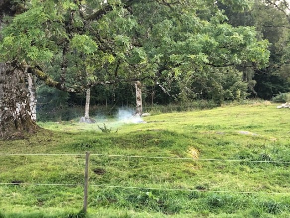 När jag kom hem hade Axel eldat upp den stora rishögen i hagen vid huset och börjat greja lite med staketet mellan ”slusshagen” och sommarhagen. Vi har ändrat det staketet ett par gånger genom åren och det är lite klurigt för det är berghäll så det är svårt att få ner stolp där vi vill ha staketet. I början hade vi det i slusshagen så nära berghällen det gick, och nu det senaste har vi haft det på andra sidan stenmuren i sommarhagen, men då blir det en smal remsa mellan staketet och stenmuren som inte betas. Det blir dessutom dumt för hästarna från andra sidan, att ha en stenmur som de halvt kan klättra över och sen hamna i staketet på andra sidan. Och för fårens del (som gärna får beta i sommarhagen) kan vi inte få ner stolp tillräckligt tätt för att deras lägsta tråd inte hamnar i backen. Dumt va! Så nu provar vi att sätta stolparna i stenmuren i stället.