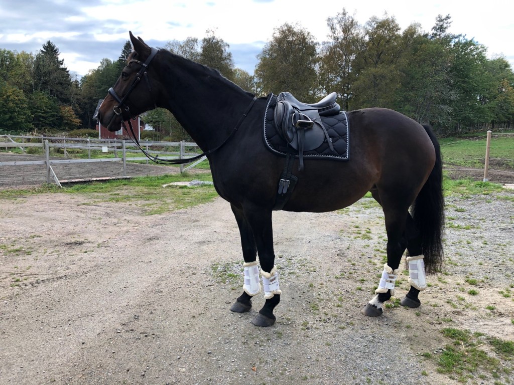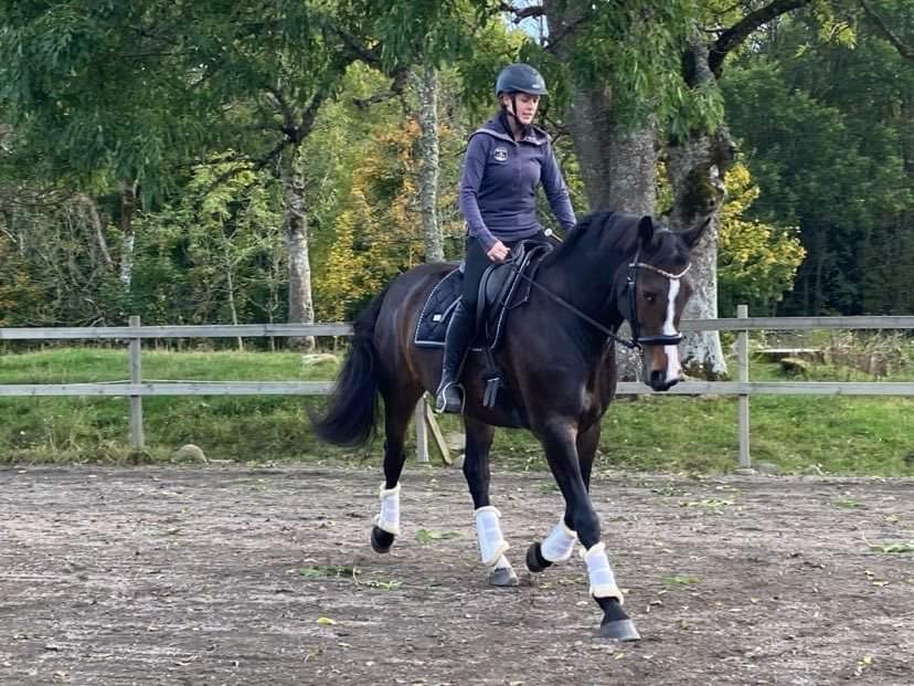 Därefter följde lite skrittpaus och vi gick över till att jobba lite i skritten när vi fått andas ut lite. Vi gjorde ”fyrkanten” i skritt vilket innebär att men går på en fyrkant och i varje hörn lägger man in en kvarts framdelsvändning. Väldigt lösgörande och Kaprifol blev mjuk som smör och flyttade fint undan i båda varven. Vi fortsatte sedan på samma tema och red lite skänkelvikningar i skritt och trav. Jag är ju värdelös på detta och får inte riktigt till tajmingen med skänklarna, men det gick bättre och bättre! Det roliga här var att Kaprifol var superfin i traven mellan skänkelvikningarna, i båda varven. Efter en paus kan gärna den där vänsterbogen vara ”utanför kroppen” igen, men nu var hon verkligen ihop hela tiden och följde med jättebra åt båda hållen.