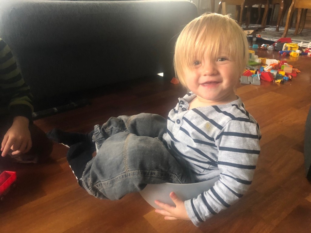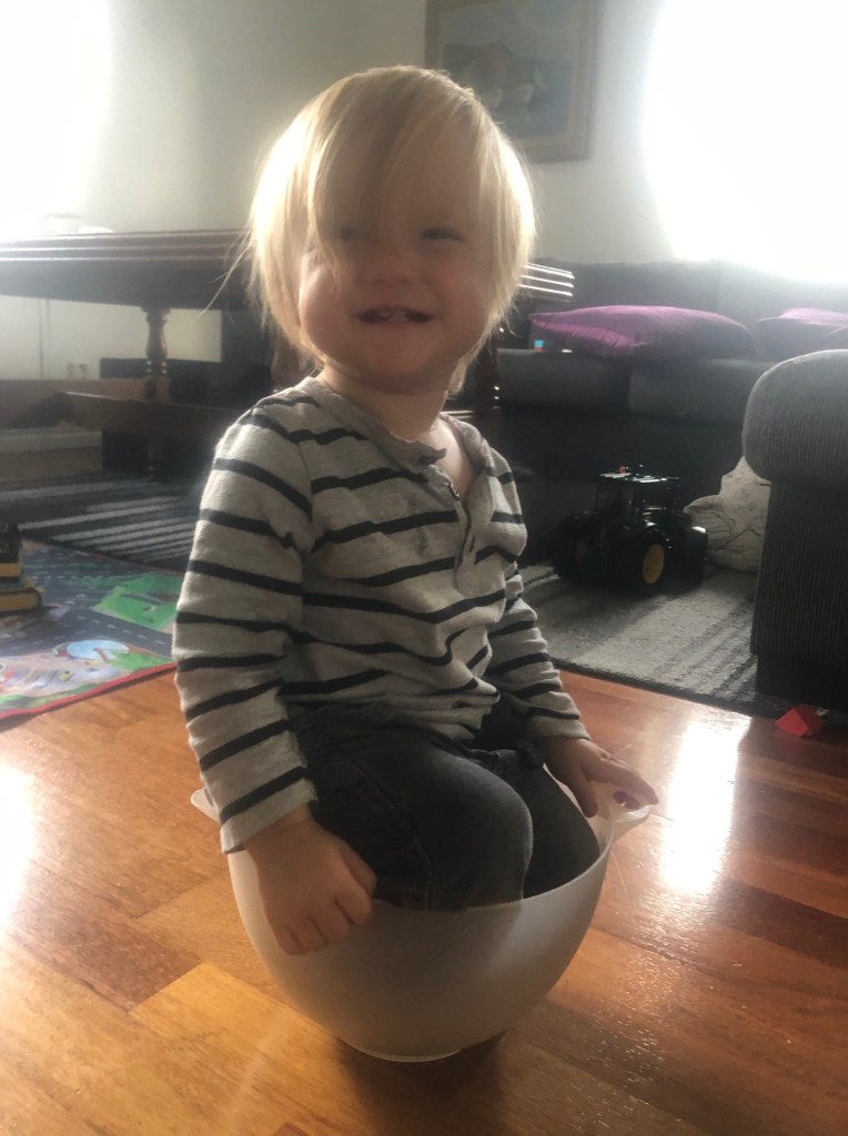 Nora älskar att leka med bunkar, oftast ska den sitta på huvudet, men just här skulle den sittas i. När Loke var i denna åldern var det kastruller och lock som gällde, men här är det som sagt bunkar.