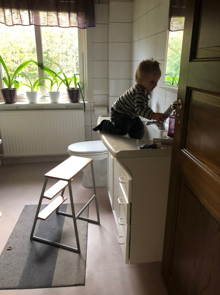 Efter maten städade vi i ordning köket och Nora var inne i badrummet och grejade. Hon kom inte när vi ropade på henne och det var märkbart tyst och då kom jag på att jag dragit fram pallen en stund tidigare, när jag skulle klättra upp och ta ner grejer från över spegeln. Och ja, hon hade inte stannat högst uppe på pallen inte.