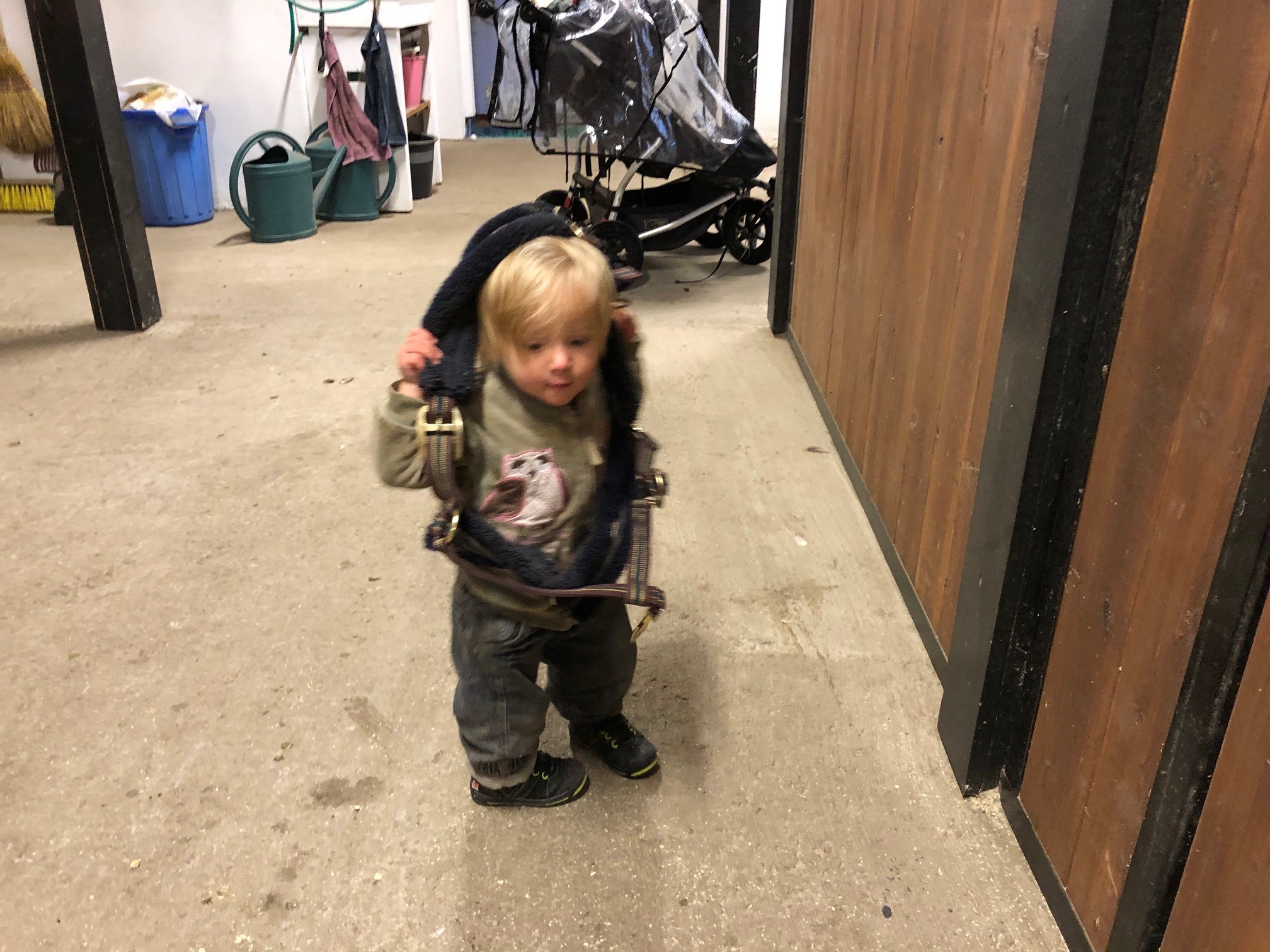 Av den anledningen jobbade jag halva dagen i Borås i går, och tog eftermiddagen hemma då jag hade möte och utbildning 13-17. Sista timmen utbildning var bara eget arbete dock, ett ”leka runt” i det nya systemet, så den skippade jag igår faktiskt, jag tar igen det en annan dag om det behövs. Jag hann då säga hej till Axels föräldrar innan de åkte tillbaka till stugan, sen åt vi middag och så tog jag med mig barnen ut till djuren och stallet. Hönsen togs in, fåren fick kvällsmat, kaninerna fick nytt hö och så var det min mockdag. Barnen hjälpte till! Det var inga hästar vid stallet så barnen kunde vara med utan bekymmer. Nora tyckte vi skulle rida, hon hämtade Assims grimma och tog med sig in i hagen, så gulligt!!