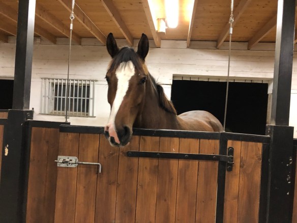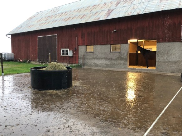 En av hästarna i stallet, Anna, gillar att stå inne när det regnar och kom snart gåendes när det började droppa från himlen. Det är väl det bästa med lösdrift, att hästarna kan gå in (och ut) när det själva vill? Det regnar ju gärna lika mycket dagtid som nattetid.