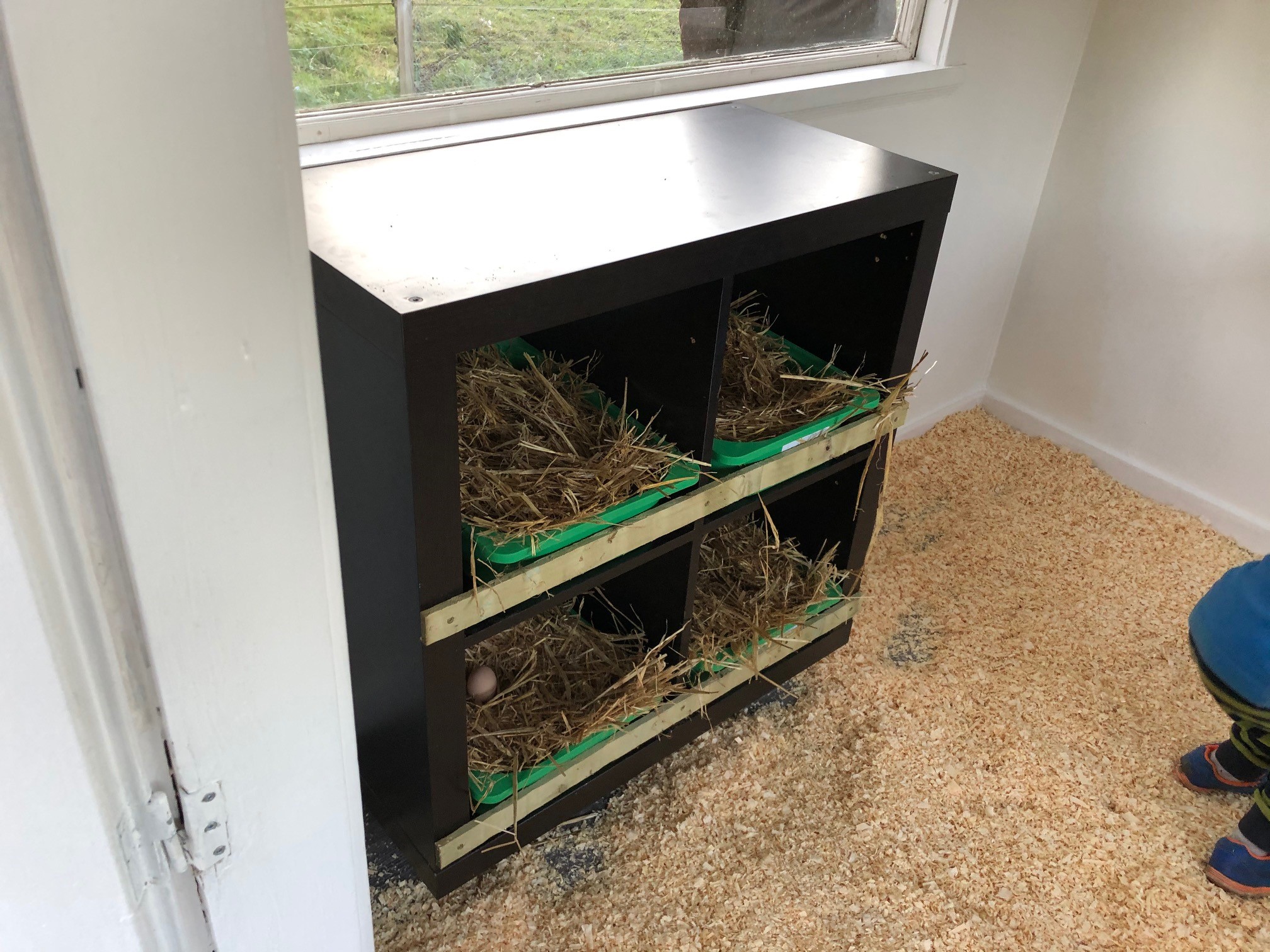 Och sen skulle redena upp på väggen! Mycket IKEA-grejer blir det här! Bajslådan hittade vi för 75kr i fyndhörnan, hyllan köpte jag ju begagnad men även den är från IKEA (kallax) och de tjusiga gröna lådorna är från stuva-serien. Komplett med ägg i redet så hönsen verkligen fattar vad de ska göra där inne, hehe.