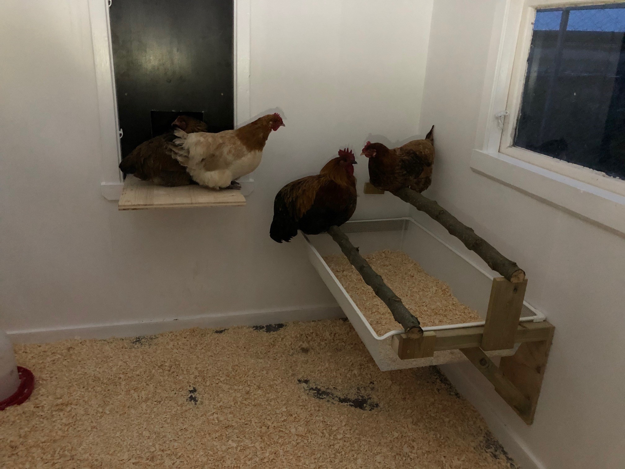 Jag tog mig hem lite tidigare från jobbet så vi skulle hinna fixa inredningen i huset innan hönsen skulle gå och lägga sig för kvällen. Först ut var sittpinnar och ”bajslåda”.