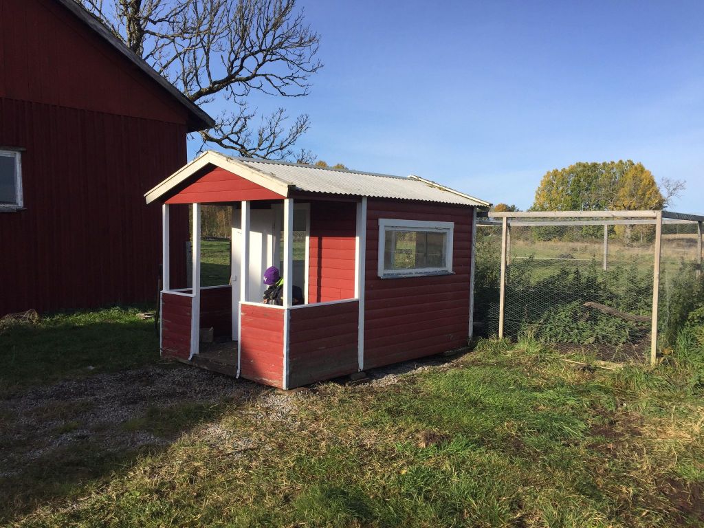 Det som saknas nu är en trappa/stege till fönstret både på insidan och på utsidan, och så ska vi hänga upp mat-och vattenskålarna i taket. Hönsgården ska tätas lite också, så som det ser ut nu kan kycklingar och lika små djur gå under hönshuset och in/ut från hönsgården, och det är ju inte så lyckat. Men det är på plats och det går att använda!