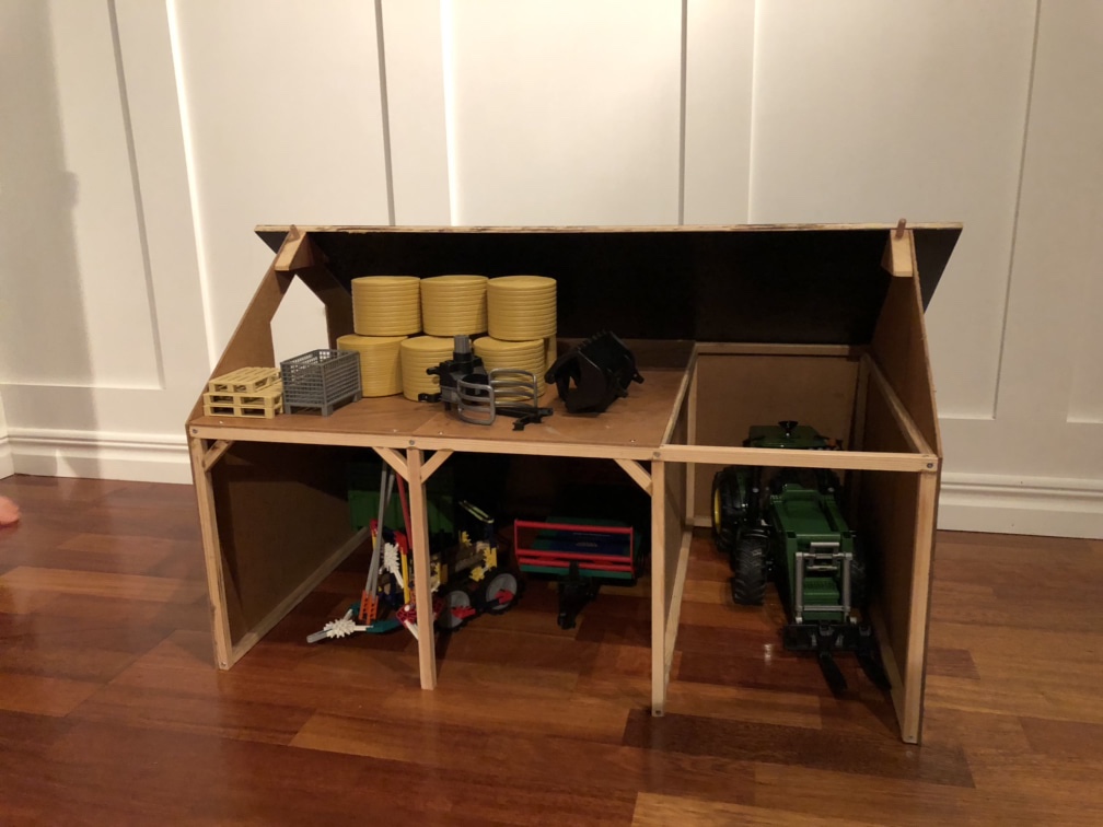 Axel började ju på Lokes garage i går och idag blev det såpass klart att vi tog in och ”provlekte” lite. Det ska på dörrar på öppningen till höger, en bottenskiva, och så lite färg också. Det finns en takskiva till också utanför bild, kanske gångjärn på den också vore kalas.