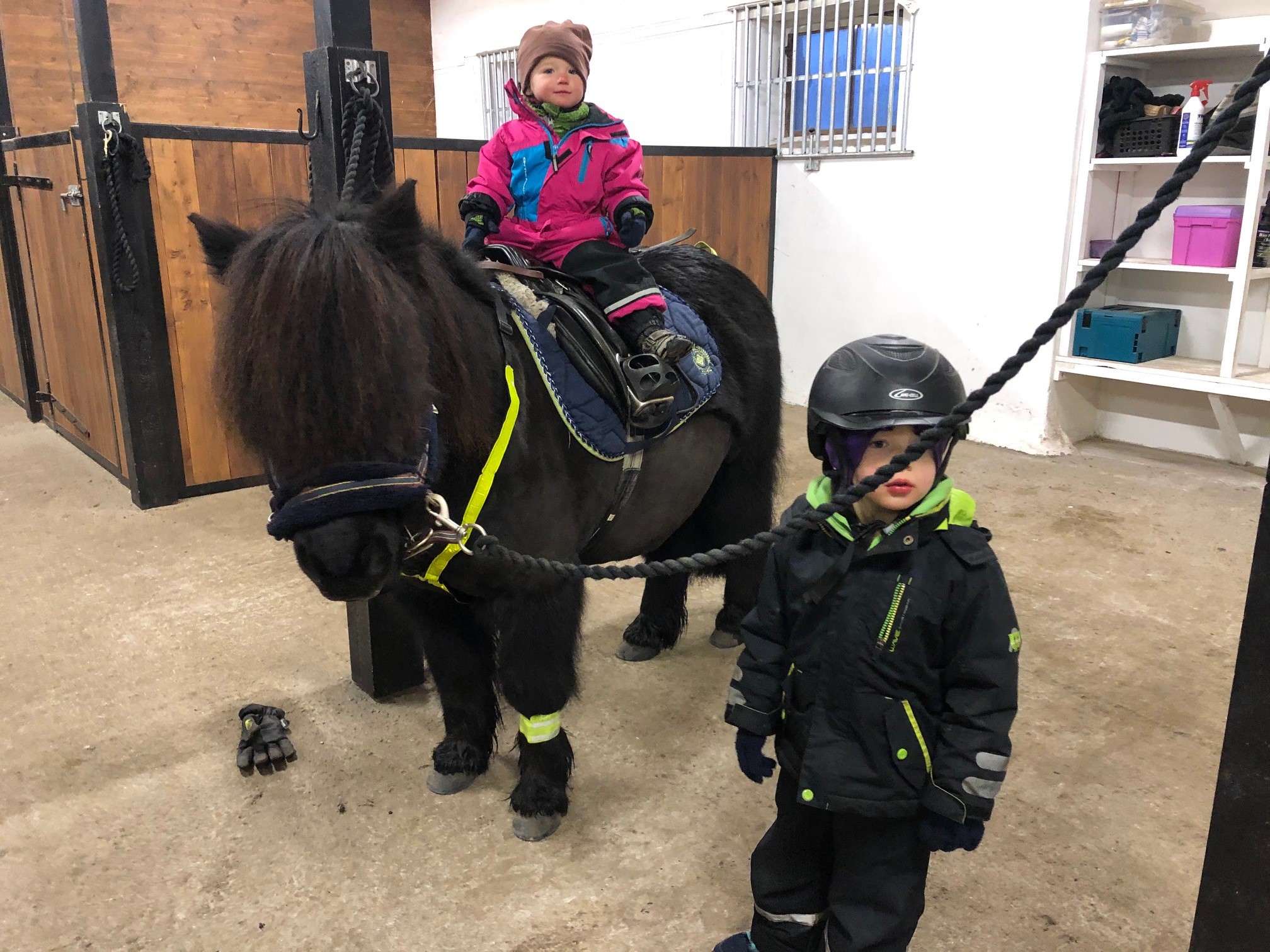 Just det. Sitta på Assim, hahaha. Men det fick hon ju inte, för Loke skulle ju rida. Loke blev ledsen, Nora blev arg. Ner med Nora i vagnen och upp med Loke på ponnyn, pappa körde barnvagnen och jag hoppade upp på Kaprifol. Loke var fortsatt ledsen 100 meter senare, och det visade sig att han behövde kissa. Jag satt kvar på Kaprifol och höll i ponnyn medan Axel parkerade Noras vagn och hjälpte Loke av med alla kläder så han kunde kissa i en buske. Upp på ponnyn igen och mamma skulle INTE hålla i grimskaftet, det skulle pappa göra.