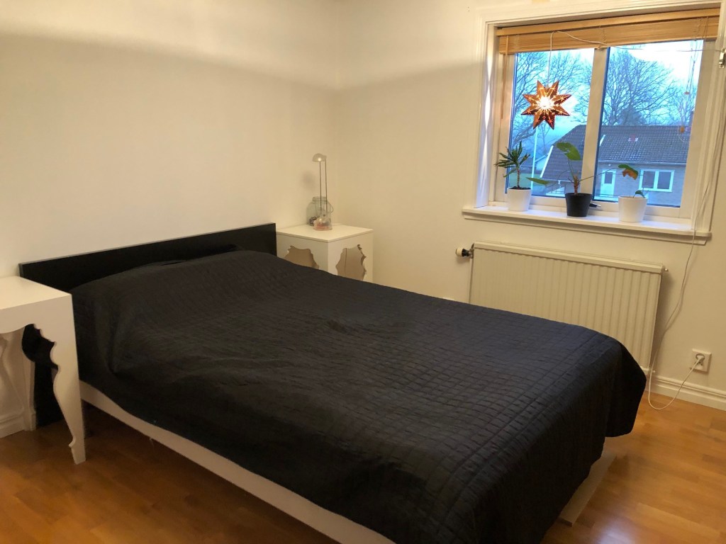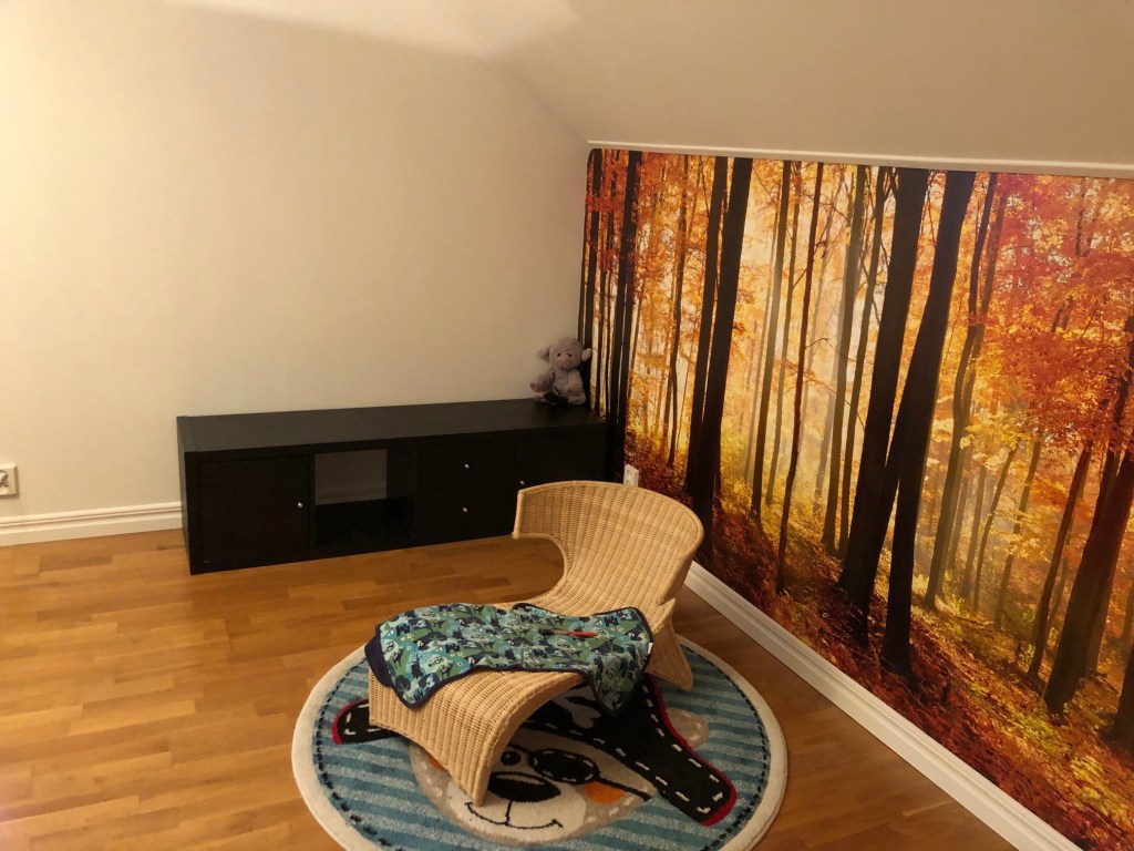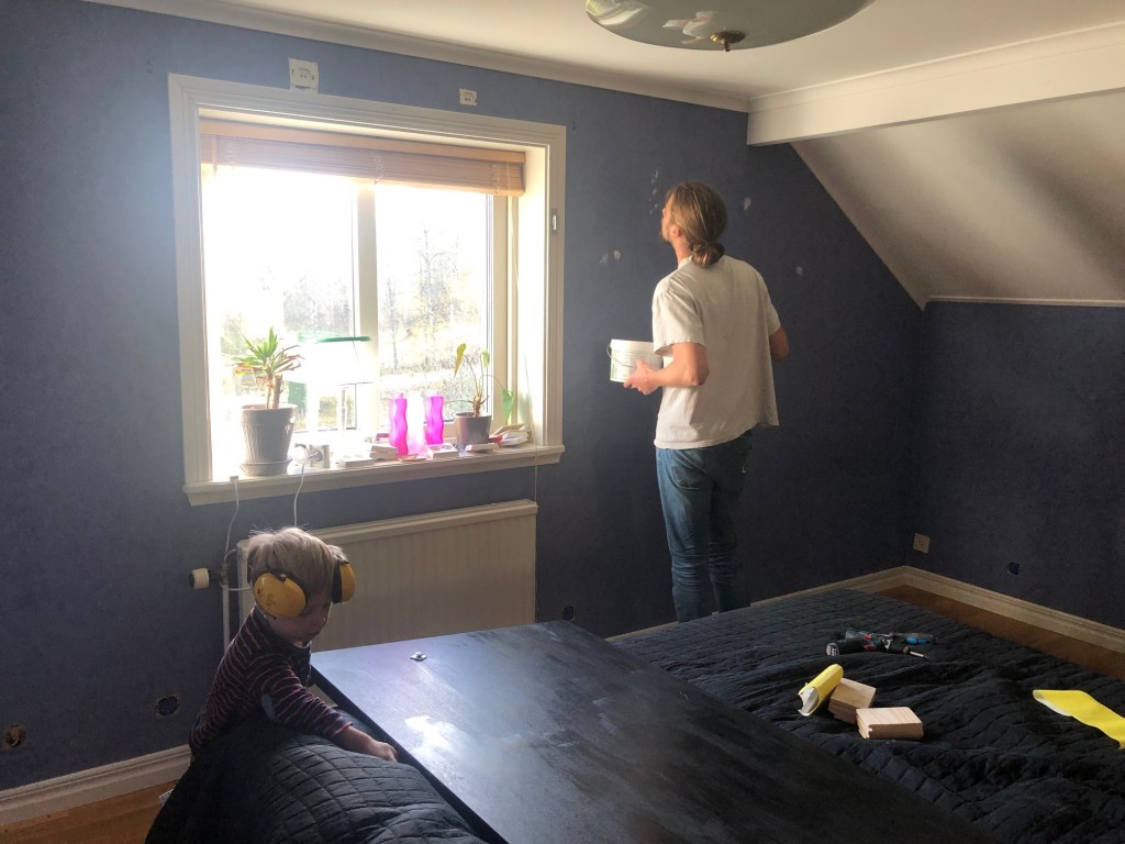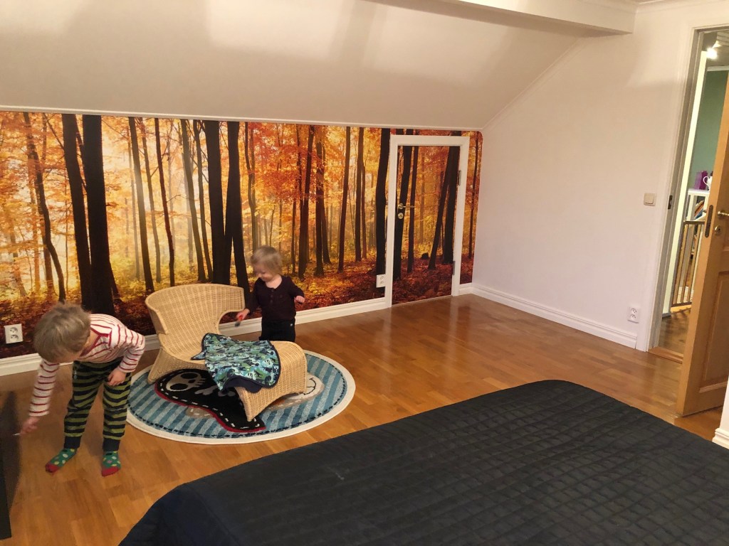 Vi har inhandlat en ny gardinstång som ska upp så fort de nya gardinerna anländer (idag tror jag). Och sen ska vi bära upp Noras säng från gillestugan, vi har tänkt att spjälsängen ska stå kvar inne i vårt sovrum och så ställer vi in barnsängen här inne (antagligen där den svarta hyllan står just nu). Den stora sängen får stå kvar ett tag till, så rummet kan användas som gästrum en stund till. Vi får se hur smidigt det går att flytta över Nora hit helt enkelt.