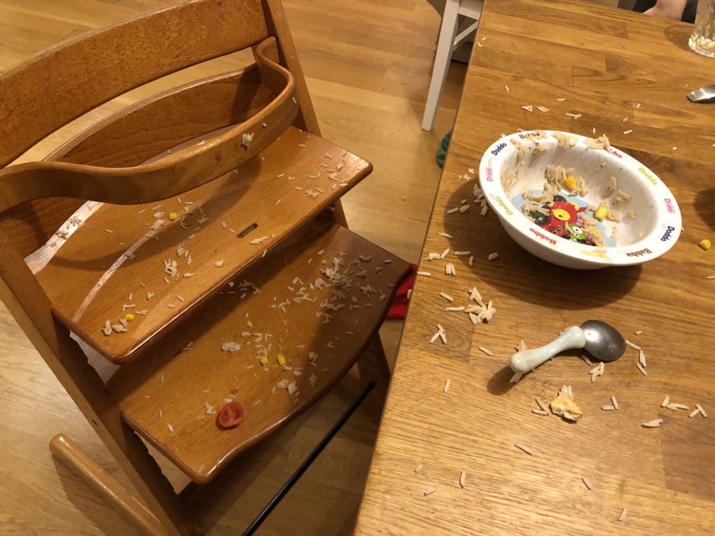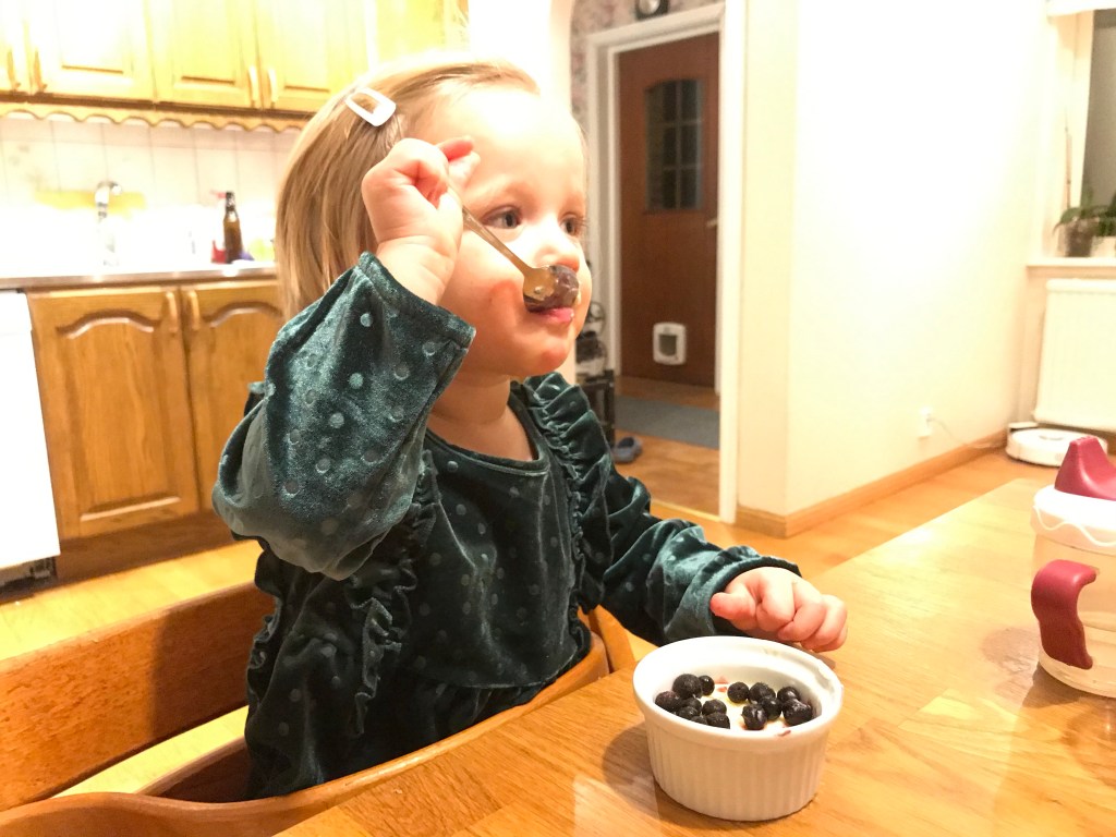 Till huvudrätt blev det lammstek, ris, sås och grönsaker. Nora tyckte det var kalasgott, men just ris är ju inte alltid så lätt att äta när man är liten och ändå ska äta själv.