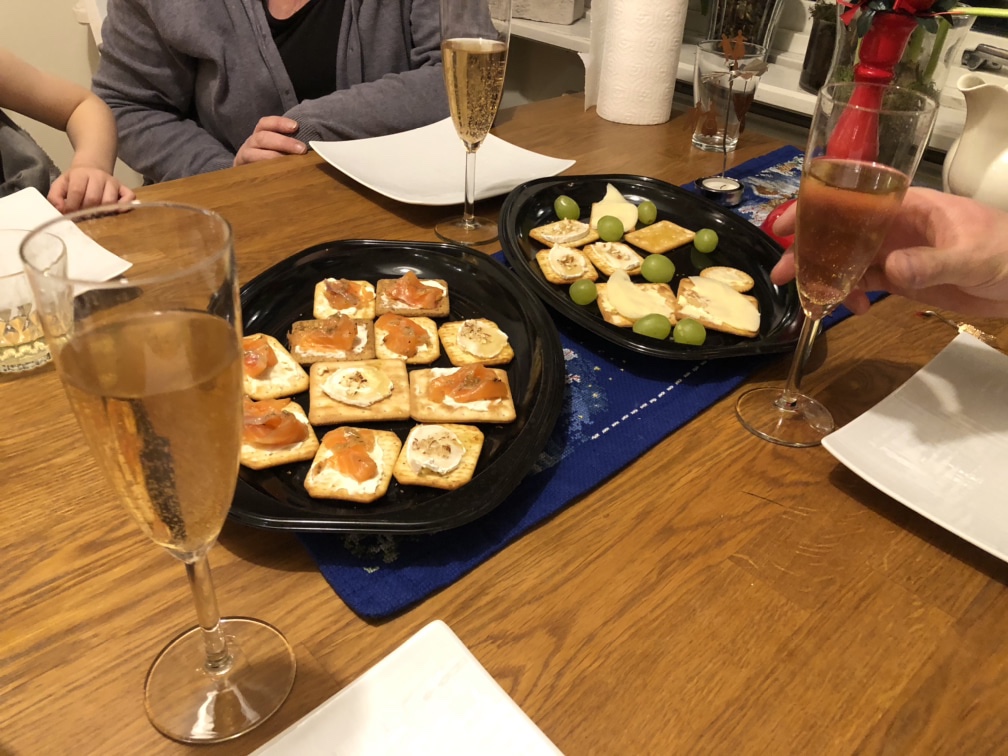 Får väl inleda med Gott Nytt År! Vi har haft ett lugnt och trevligt nyårsfirande, mormor kom igår och firade med oss. Vi var ute större delen av dagen med barnen medan Axel reglade upp hålet i hallen och vi fick även in garderoben på plats!! Men innan allt var klart blev det förrätt. Enkla och goda kex med lax och getost med honung.