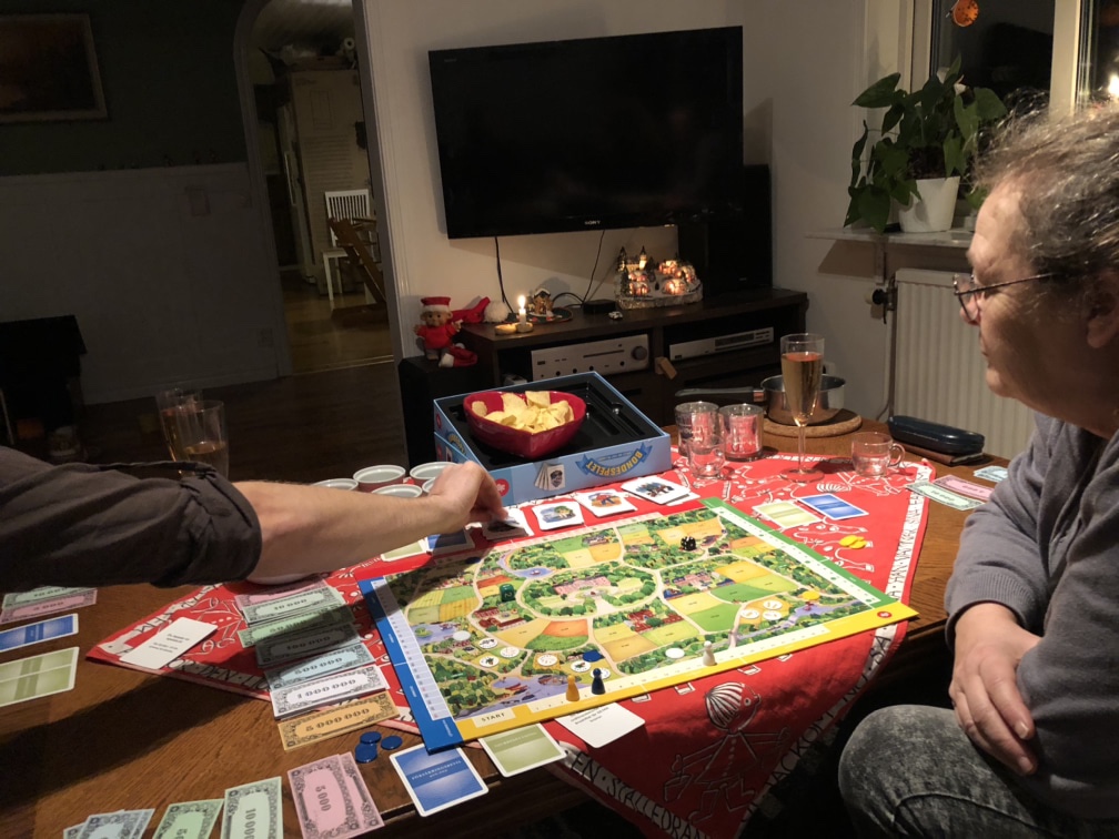 Barnen somnade i vanlig tid men vi vuxna var ju tvungna att hålla oss vakna. Vi spelade då en av Axels julklappar; Bondespelet. Riktigt roligt! Men det tog tid!! Så vi är inte klara än utan ska fortsätta nu i kväll, haha.