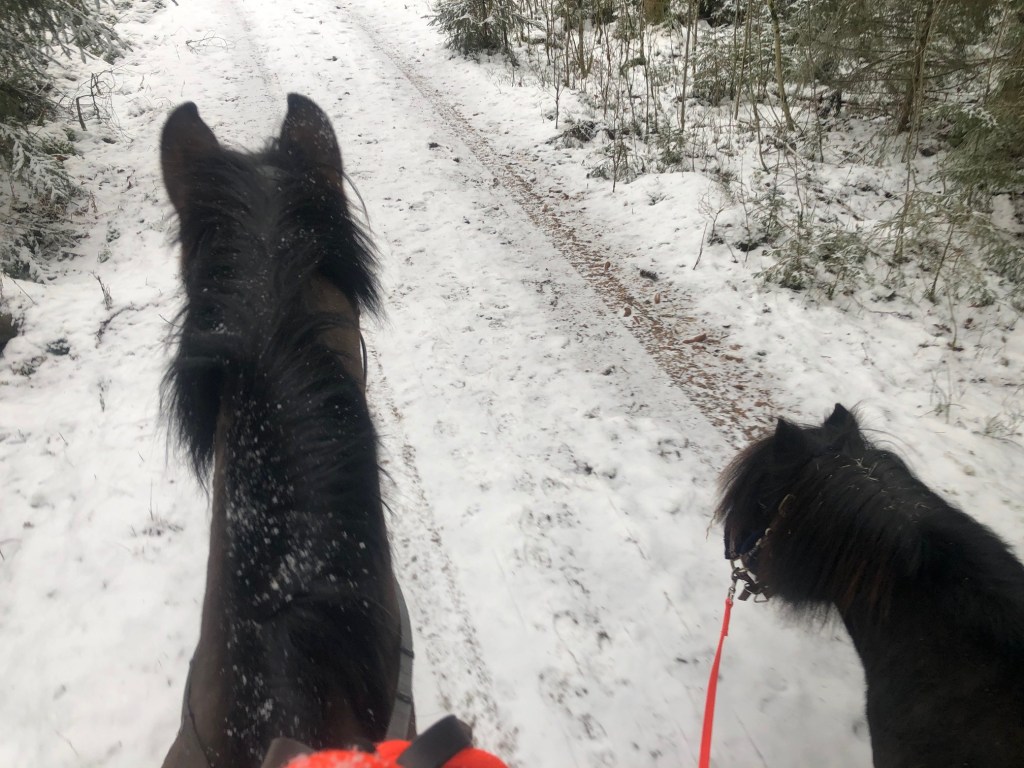 Hästarna kom ut i hagen igen, jag mockade lösdriften och gick sen in och åt en macka innan alla kläder skulle på igen. Nu bytte vi skridskorna till skidor! I alla fall på Loke, vi höll oss till skor och Nora satt i pulkan.