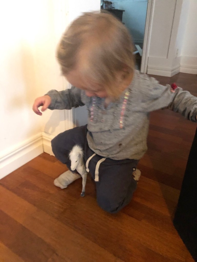 Resten av dagen och kvällen lekte vi inne. Några av mina gamla leksakshästar har åkt fram och Nora visste precis hur man skulle leka med dem, hahaha. Så gulligt. Stackarn, får se till att hon får rida lite mer på den riktiga ponnyn.