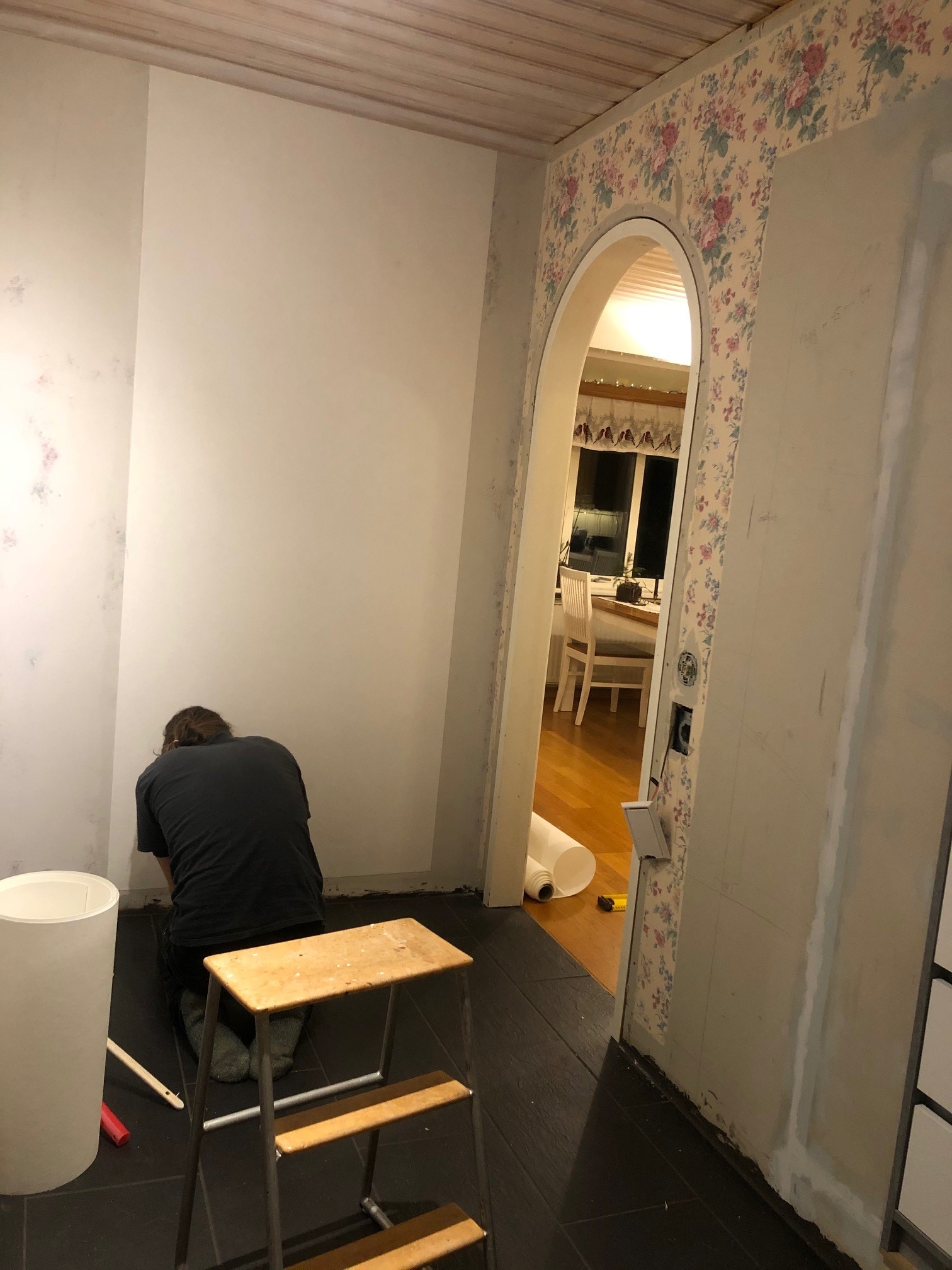 I går kväll (söndag) körde vi vidare med nästa ”stora” steg i hallen; tapetsering av renoveringstapet.