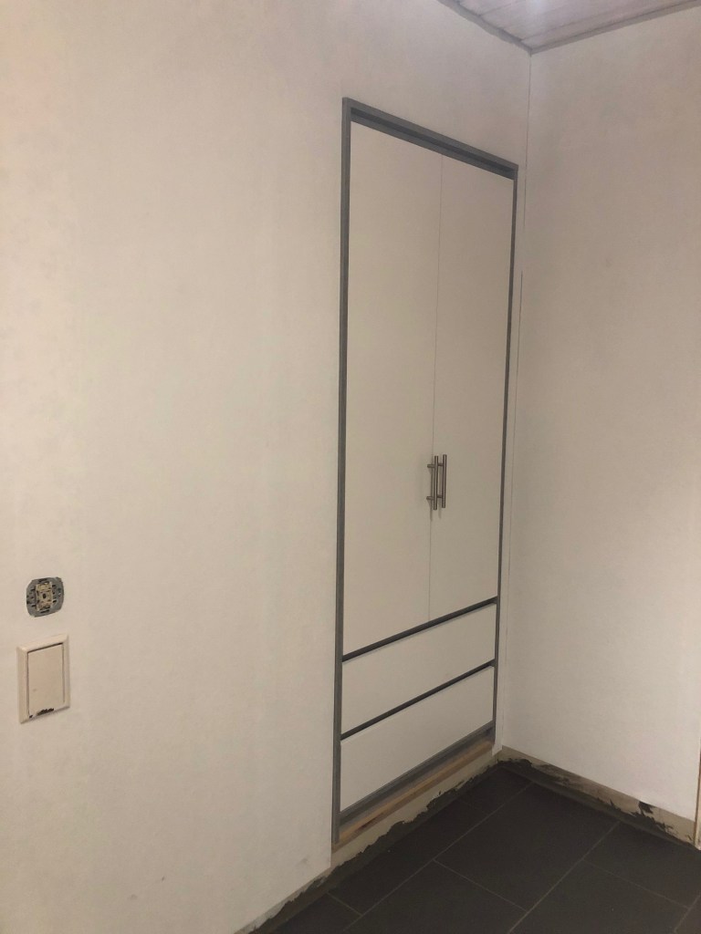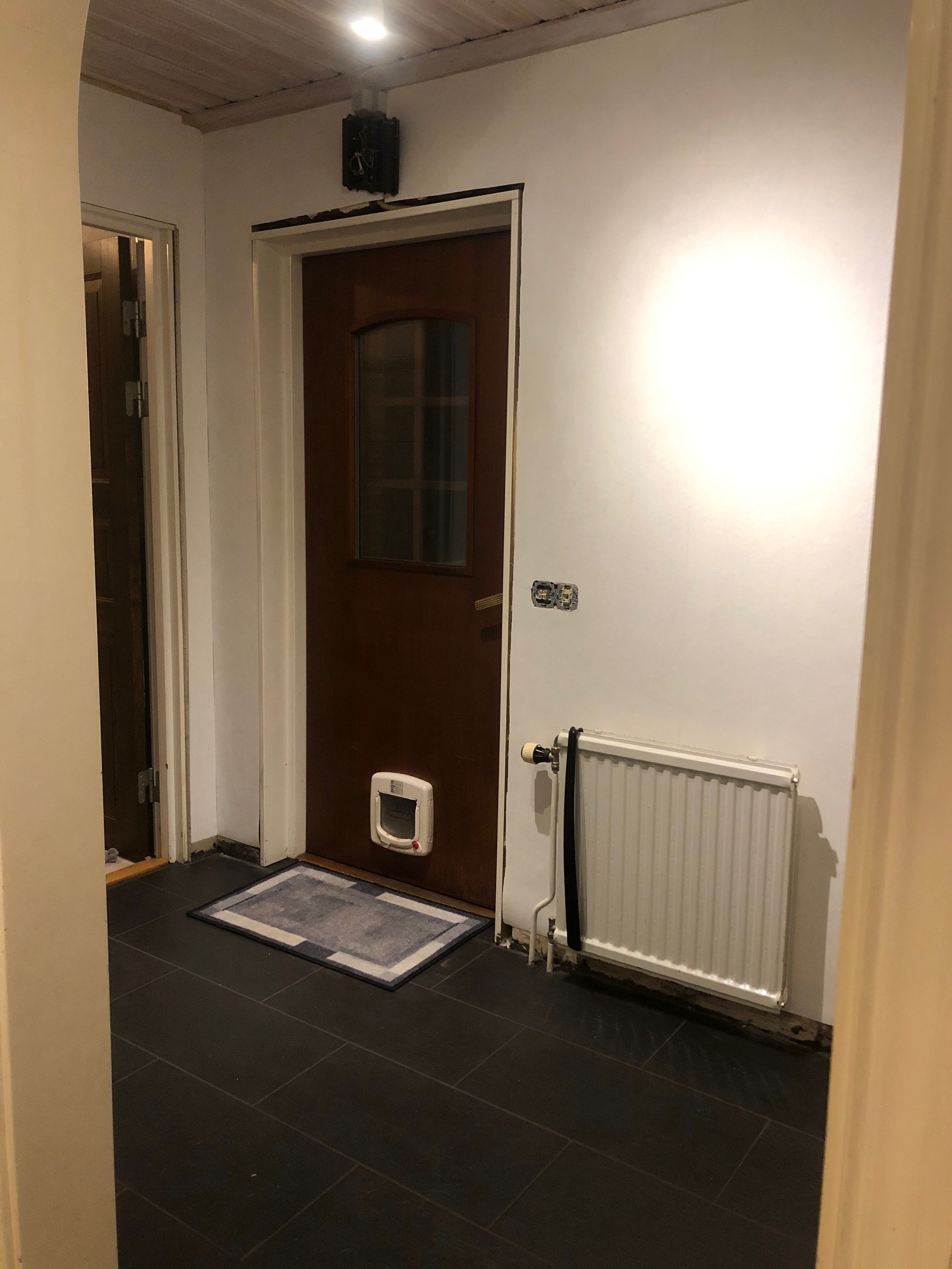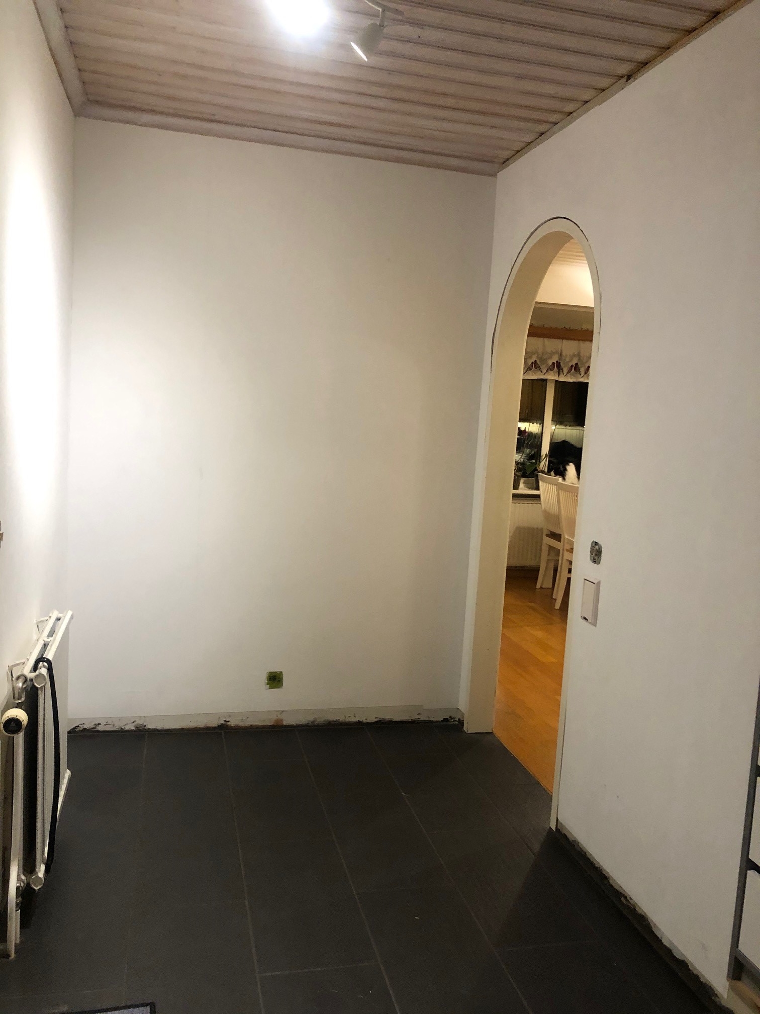Som ni ser finns det inget hål i väggen mellan valvet och garderoben, och tanken är nog fortfarande att göra ett infällt nyckelskåp, men vi har fortfarande inte hittat nått passande fönster/tavla/ram/spegel att ha som lucka. Så vi letar vidare efter det, men körde ändå på med tapeten så länge.