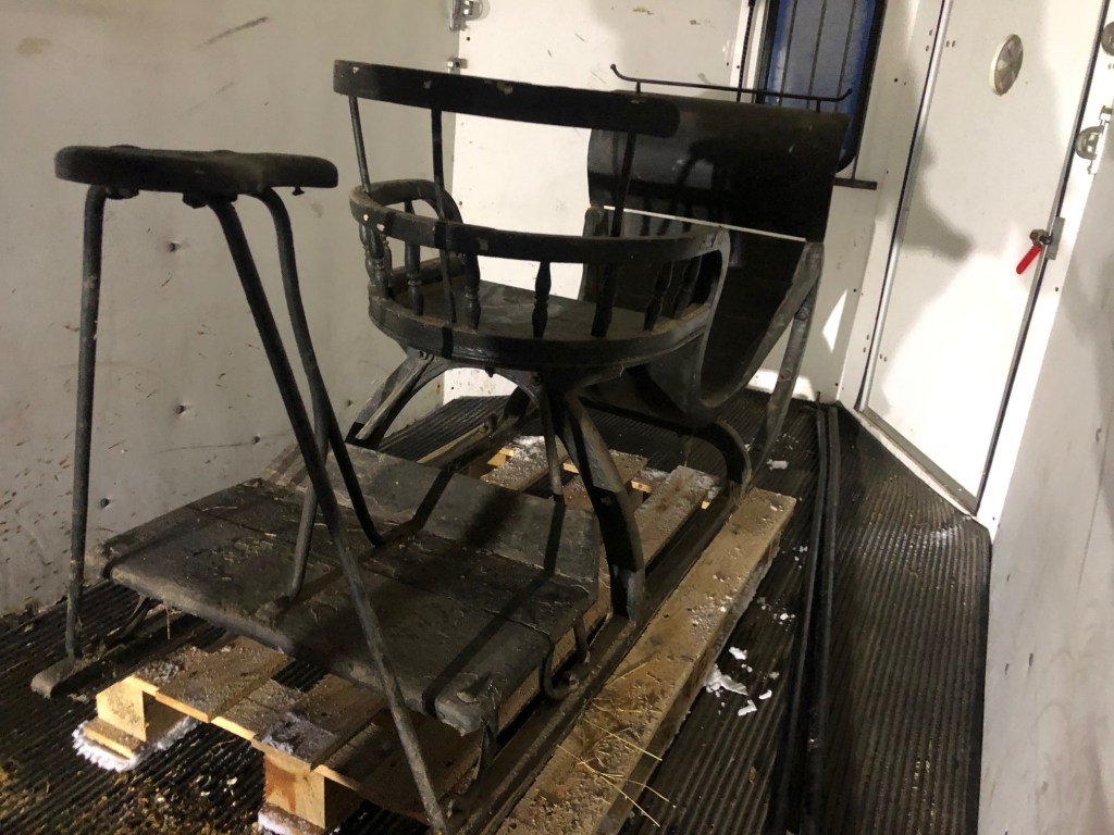Och så plötsligt fanns den där, i rätt ände av landet! Jag skickade iväg illa kvickt till både säljaren och Axel, annonsen var bara timmar gammal men det gällde att vara snabb! Och båda meddelandena resulterade i att hela familjen packade in sig i bilen senare under eftermiddagen och satte kurs mot Lidköping. En dryg timme bort och släden såg fin ut så vi fick den inlastad i transporten med hjälp av deras lastare med långa gafflar, kunde inte gått smidigare. Kolla vilken fräck!! Gissningsvis från tidigt 1900-tal.