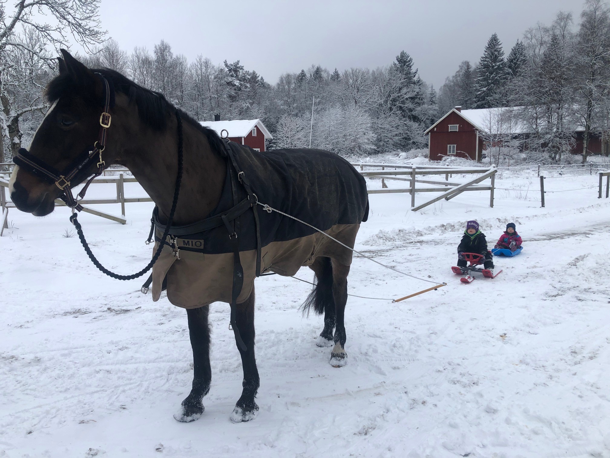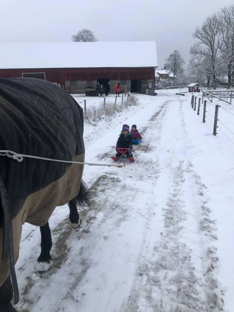 Igår åkte Axel iväg för att klippa av sig håret på eftermiddagen så då stod jag där med två barn som ville åka pulka och en häst som gärna skulle röra på sig. Fanns ju bara en sak att göra!
