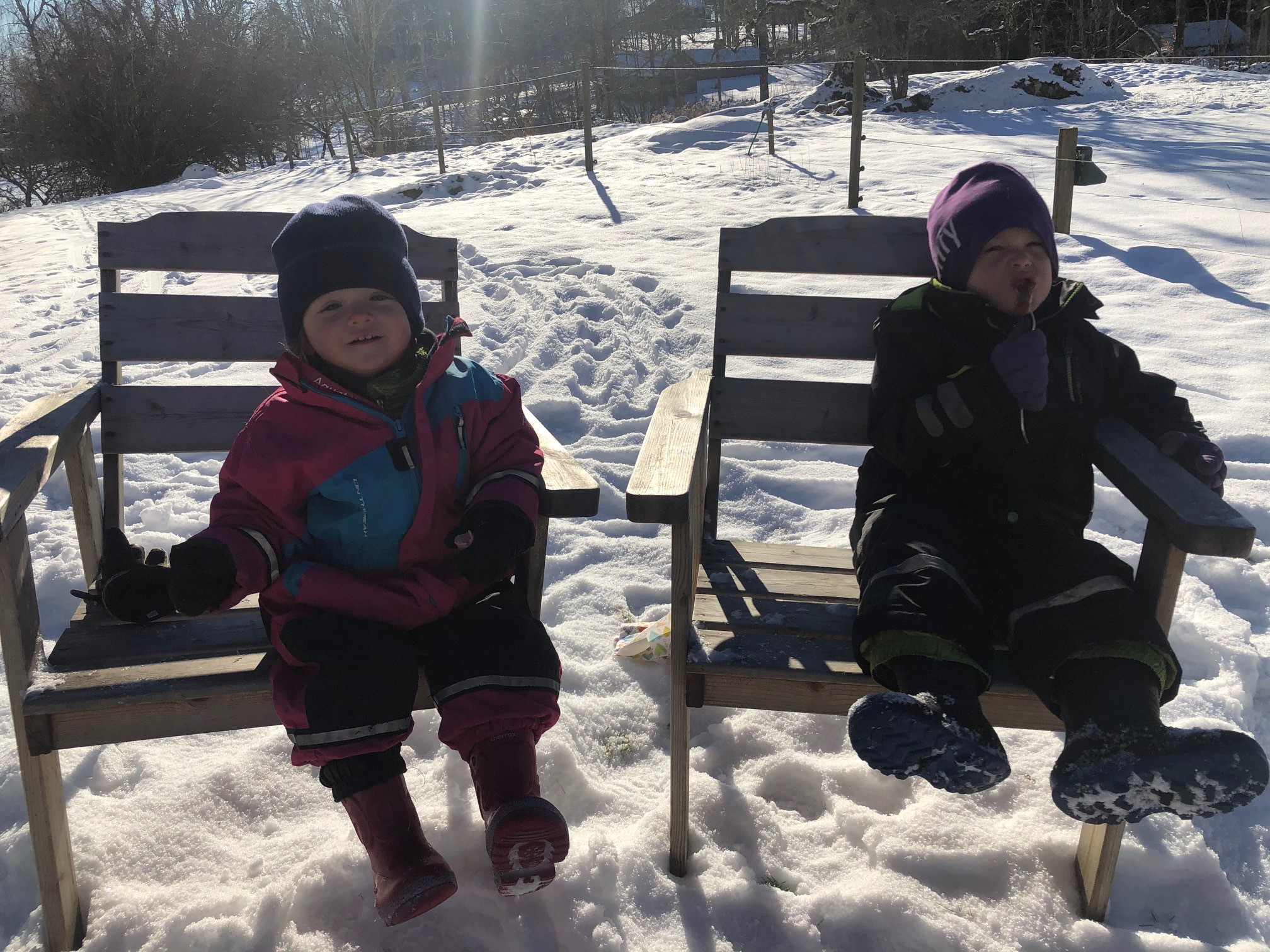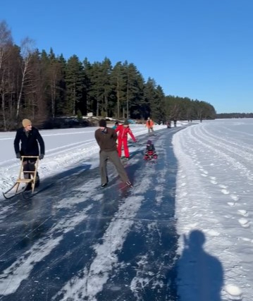 När alla korvar var uppätna gick Axel och barnen med resten av Axels familj ner till sjön för att åka skridskor, det gäller ju att passa på dessa kanske sista riktiga vinterdagar. Fin is och strålande solsken, Nora sov i vagnen och Loke åkte snowracer som Axel drog på isen. De hade åkt hela sjön runt vilket är en mil ungefär, inte illa!