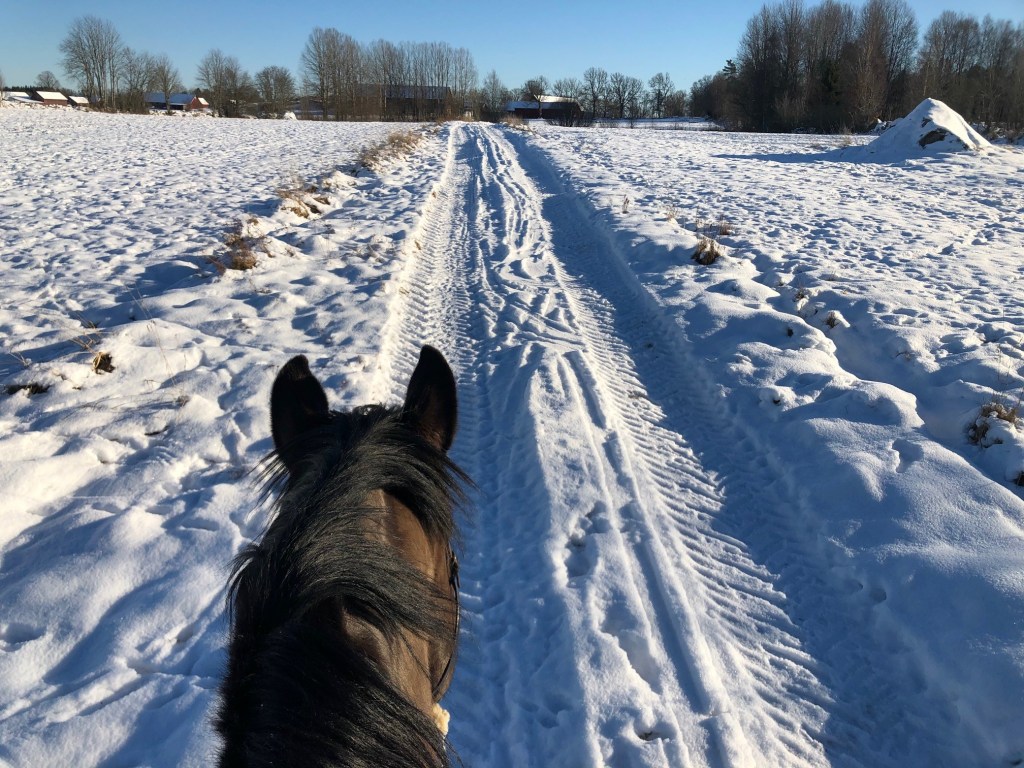 Axel kom precis i tid för att jag skulle lägga Nora och när hon somnat och han ätit lunch stack han ner till isen för en skridskorunda. När han var tillbaka var det min tur att vara barnledig och jag red ut på Kaprifol såklart! Efter lördagens galopprunda var hon nere på jorden igen, tänk att så lite kan göra sån skillnad ändå. Vi tog en skrittrunda i skogen när vi kikade på lite alternativa stigar, ganska smidigt när det är snö eftersom man lätt ser att stigarna är välanvända. Det blev inga större vinster den här gången, men vi hade det mysigt i alla fall! En lång galopp blev det också!