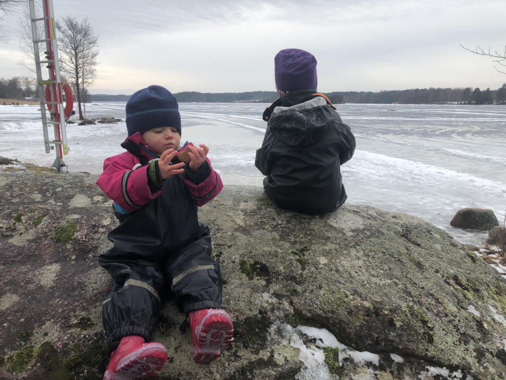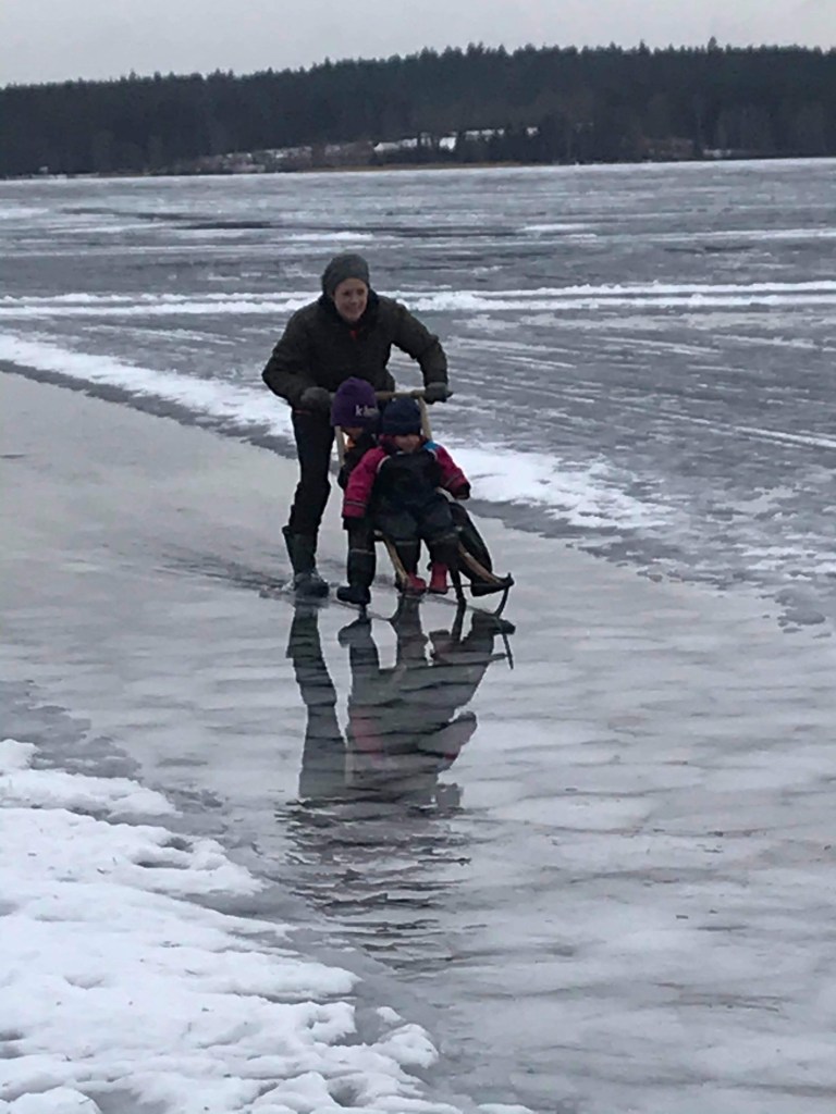 Vi inledde dagen med en tripp ner till sjön. Isen är ju inne på sina sista dagar så Axel snörade på sig skridskorna och åkte ett varv medan jag och mormor roade oss och barnen lite runt badplatsen.