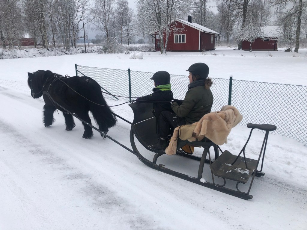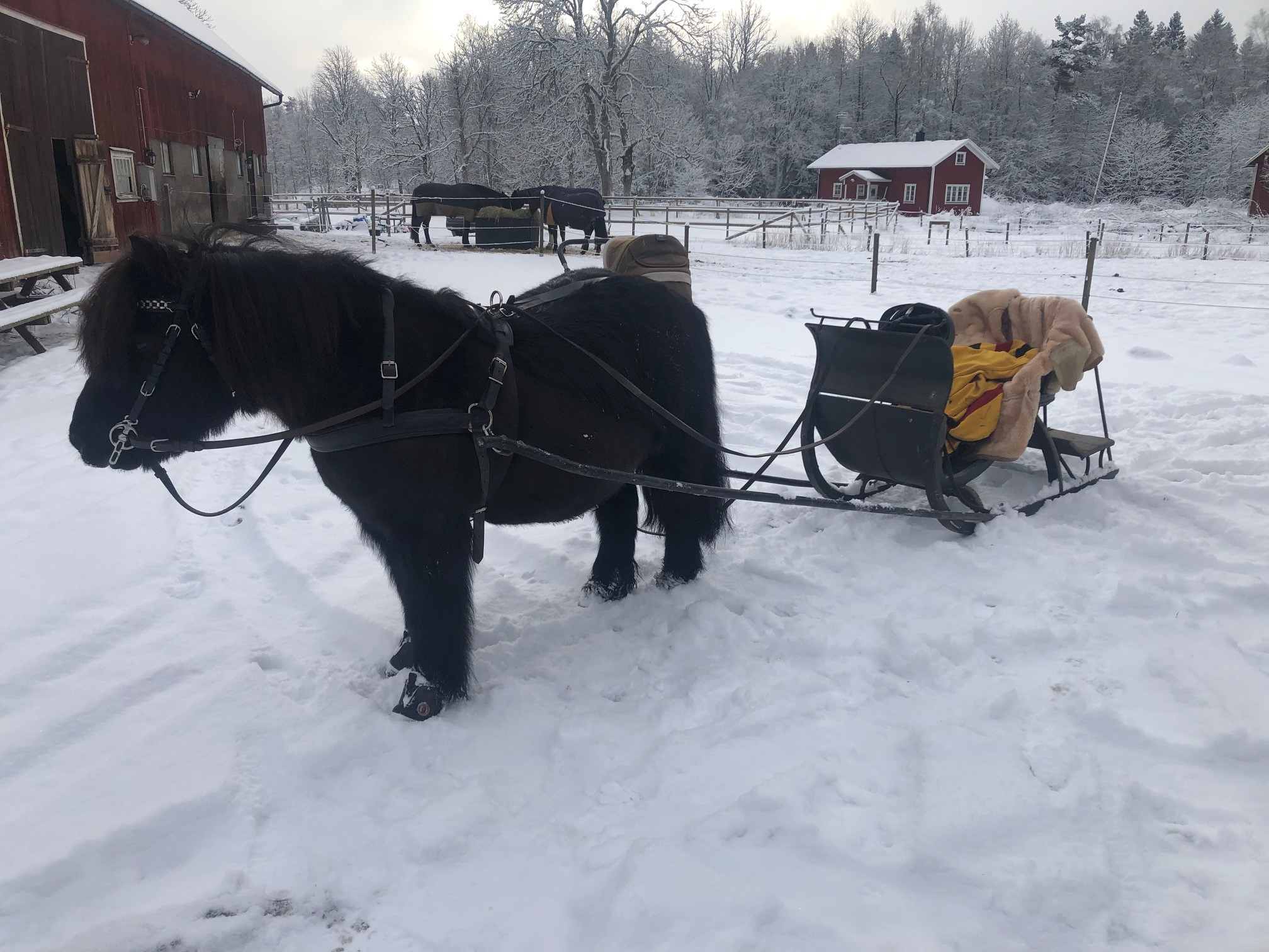Igår åkte Axel iväg för att klippa av sig håret på eftermiddagen så då stod jag där med två barn som ville åka pulka och en häst som gärna skulle röra på sig. Fanns ju bara en sak att göra!