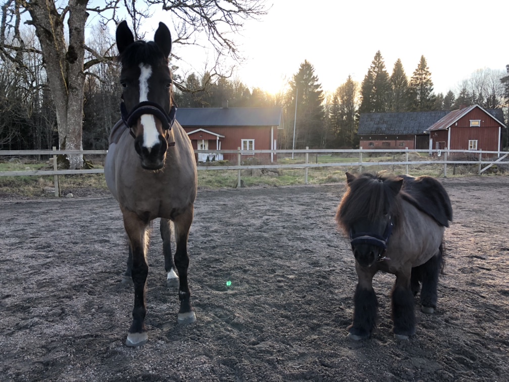Ja nästan i alla fall. Även om det är mycket ljusare när jag kommer hem efter jobbet på dagarna så är det ju änna bäcksvart när barnen somnat och jag går ut till stallet vid åttatiden. Min ursprungsplan igår var att rida ett dressyrpass på banan men det var redan fyra minusgrader och banan som fortfarande är rätt fuktig efter snösmältningen var redan frusen och knagglig. Så jag ändrade mig snabbt till en kort ridtur i mörkret, den blev kort för pannlampan som jag hittade var rätt värdelös och hjälpte inte mycket i bäckmörkret. Men en liten skrittrunda blev det; hjälm på mig och grimma och grimskaft på Kaprifol, hehe. Vi hade med oss Assim i släptåg också så både hästarna fick en liten promenadtur.