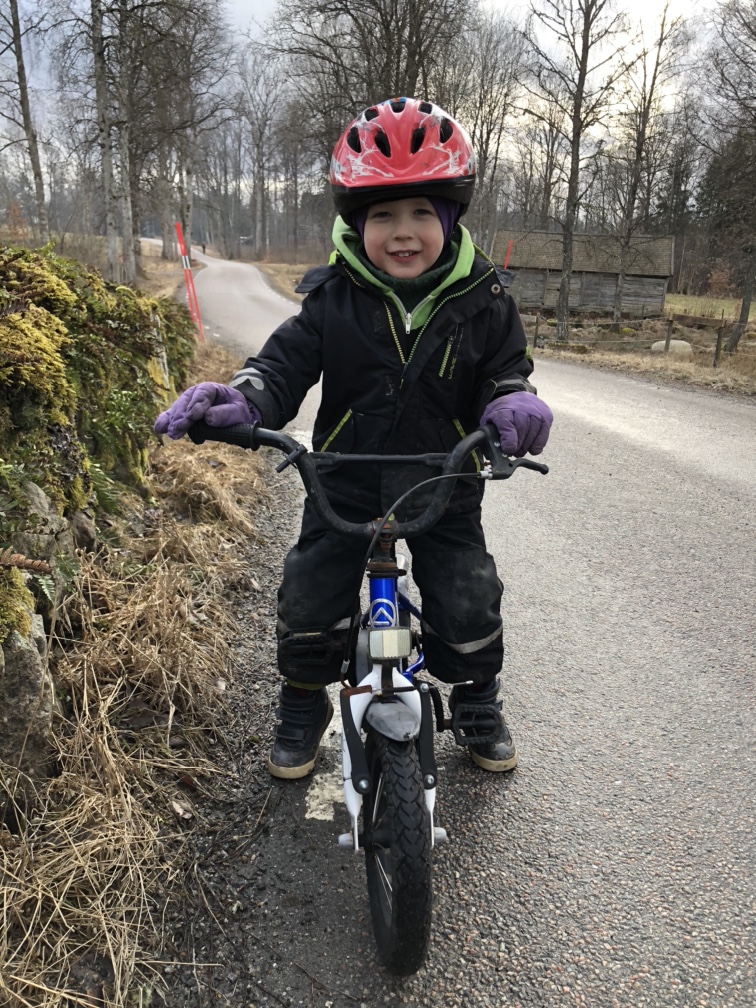 Precis när jag var klar vaknade Nora och resten av familjen kom ut. Vi tog en promenad tillsammans och Loke cyklade. Det är fascinerande hur snabbt han lär sig när väl poletten trillat ner. Han kan inte riktigt komma igång själv ännu och det blir snabbt tungt i uppförsbackarna men annars är det bara att ge honom lite start-fart så cyklar han helt själv, och stannar också utan att behöva drutta i backen.