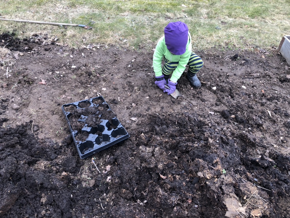 När jag var klar med hästen körde vi lite gödsel till grönsakslandet och så fyllde vi kartorna för sådd med jord och gödsel. Dessa hängde med in, men innan vi stoppade i fröna fikade vi på glass.