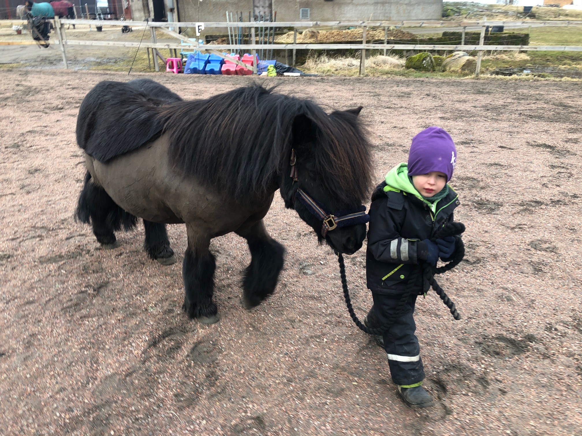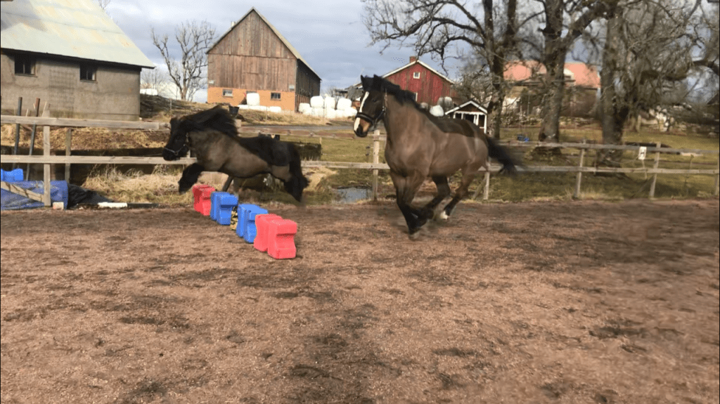 Det var riktigt blåsigt ute och hästarna kändes lite ”på tå” så när de ändå var intagna från hagen bestämde jag mig för att dagens motion fick bli bus i paddocken. Två flugor i en smäll, och barnen kunde ju vara med (utanför banan). Hästarna var på perfekt humör för bus, jag behövde inte göra mer an att ”sätta igång dem” så sprang dem kors och tvärs och busade och gjorde skolor ovan mark. Jag la ut ett hinder också som de sprang och hoppade över flera gånger, just här hoppade Kaprifol mer i luften än över hindret, men ändå!