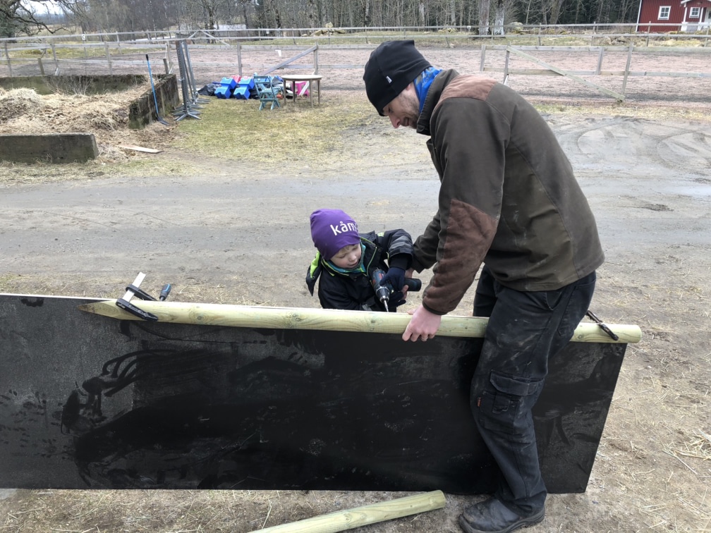 Axel och barnen kom ut samtidigt som jag var klar och vi satte igång med projekt Rutschkana. Båda barnen är galna i detta fenomen så när det blev över lämpligt spillvirke var det ju bara att sätta igång.