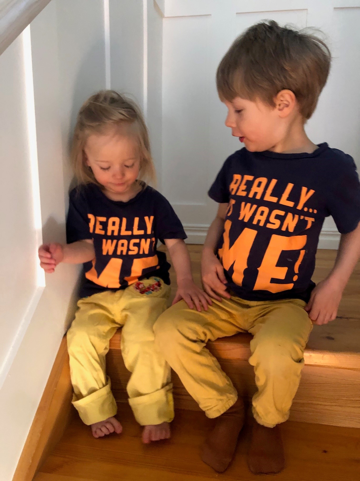Även idag blir det hemmajobb såklart, och vi äter frukost tillsammans innan jag går ner i källaren. Loke hittade matchande tröjor till sig och Nora idag som han ville att de skulle ha. Jag hjälpte honom att hitta (lite långa) gula byxor till Nora också, nästan som tvillingar va?