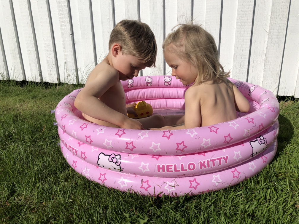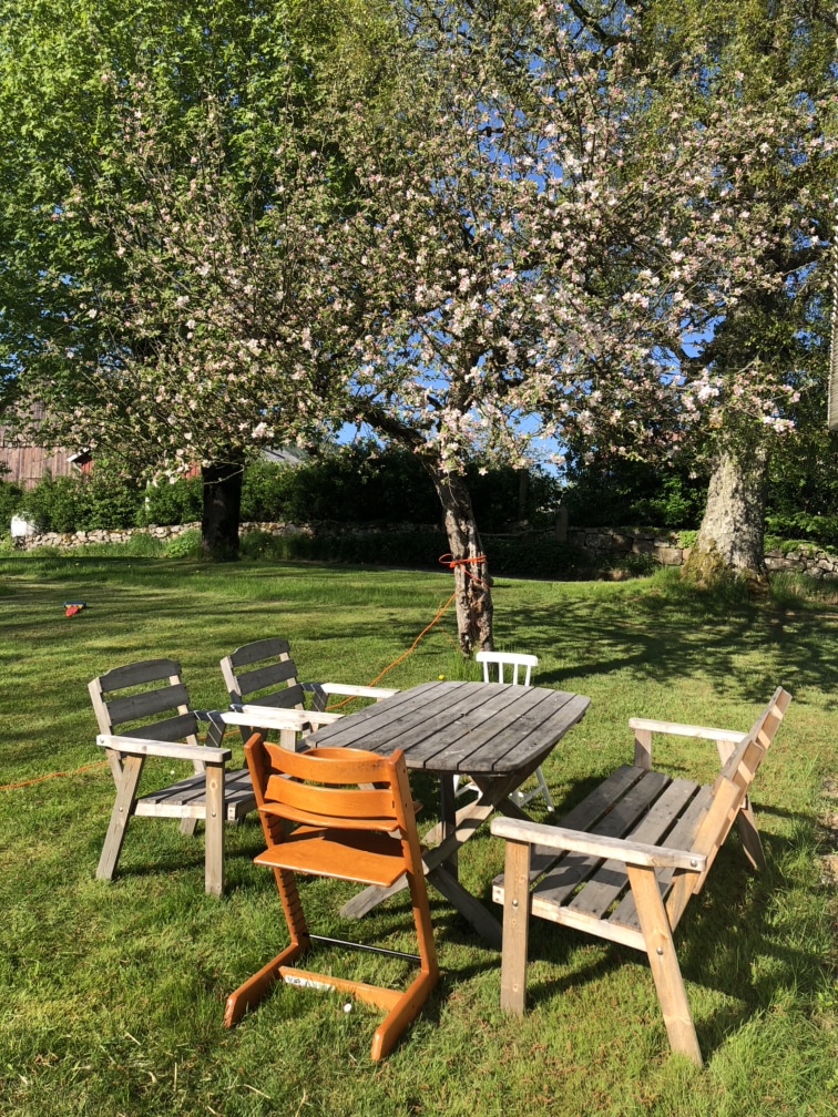 Och njutit av sommarvädret. Barnen har sprungit nakna, plaskat i lilla poolen och fått skrubbsår på knäna. Och flertalet middagar har intagits intill äppelträdet.