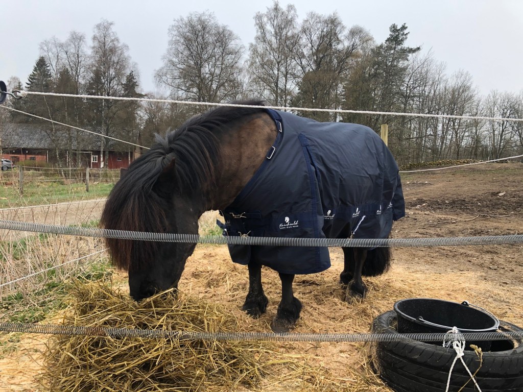 Måndag morgon började ute i stallet för att se så Assim fortsatte att hålla sig på rätt sida av staketet, och det gjorde han faktiskt så det känns ju ganska lovande. Han vispar runt spånet rätt bra så jag puttar tillbaka det så ofta jag kan så han ska fortsätta stå mjukt. Det är väl ändå så att backen under spånet är mjukare än vad det skulle varit inne i stallet med betong under så jag tror nog inte att det är någon större fara. Det går bra att medicinera honom, han får nu ett halvt gram (en halv påse) fenylbutazon morgon och kväll och ska fortsätta så i tio dagar, därefter en fjärdedels påse i fyra dagar för att trappa ner. Då blir det gissningsvis återbesök av veterinären och så får vi se hur vi fortsätter därefter.