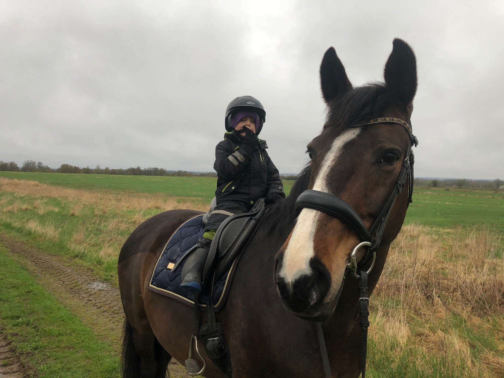 Jag startade appen när jag började skritta fram Kaprifol inför träningen och när träningen var klar stod kilometervisaren på 8.9km, och jag hade ännu inte skrittat av henne! Så jag skrittade ut runt gärdet och när vi kom tillbaka till stallet tickade den precis över till 10 kilometer, så denna ”runda” kan vi också skicka in till vår tävling där vi ska rida åtta mil. Två flugor i en smäll, nu har vi bara två mil kvar att rida och vi har resten av månaden på oss.